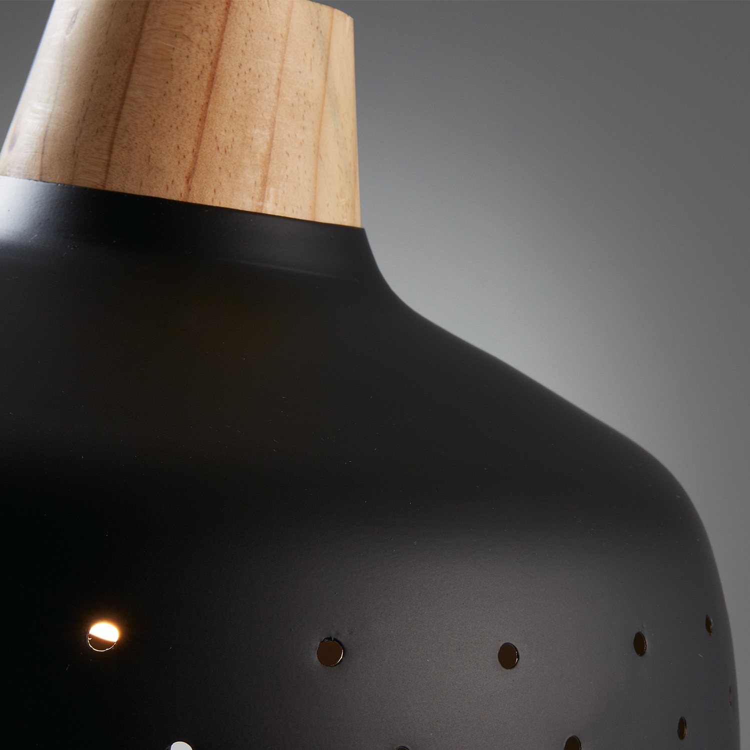 Original lámpara de suspensión fabricada en acero lacado negro, la pantalla dispone de diminutos agujeros a lo largo de su estructura que difunde pequeños haces de luz a tus paredes. Una manera diferente de iluminar espacios a la vez que decorarás con gracia.