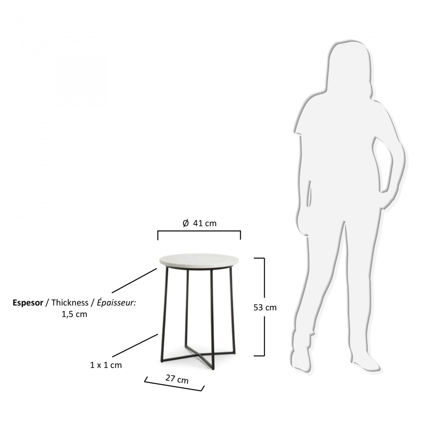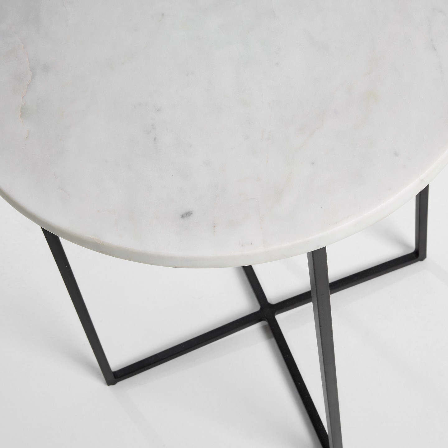 Mesa auxiliar NETBUR formada por un bonito sobre de mármol sostenido por cuatro pies de metal pintado en color oscuro que acaban unidos en forma de cruz.