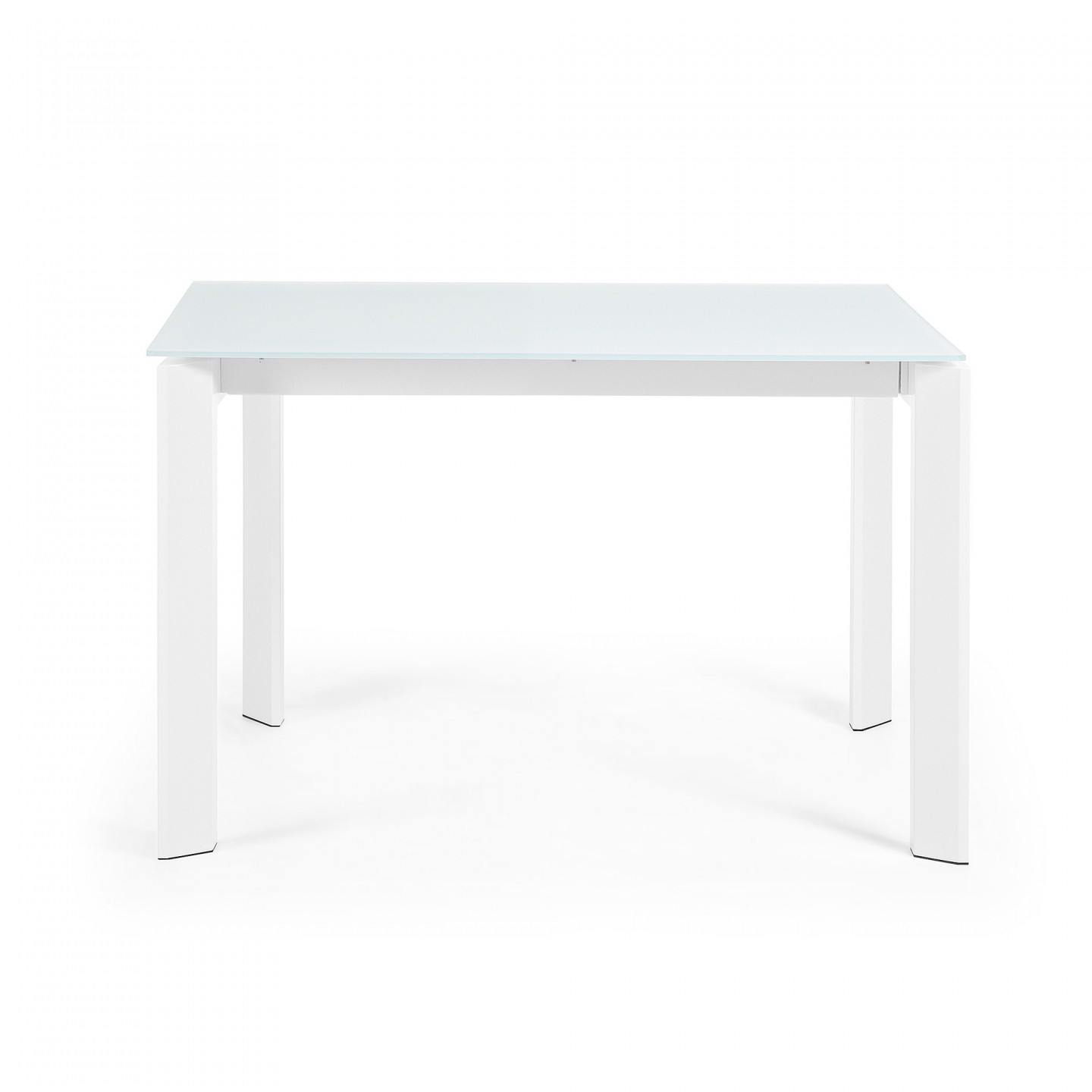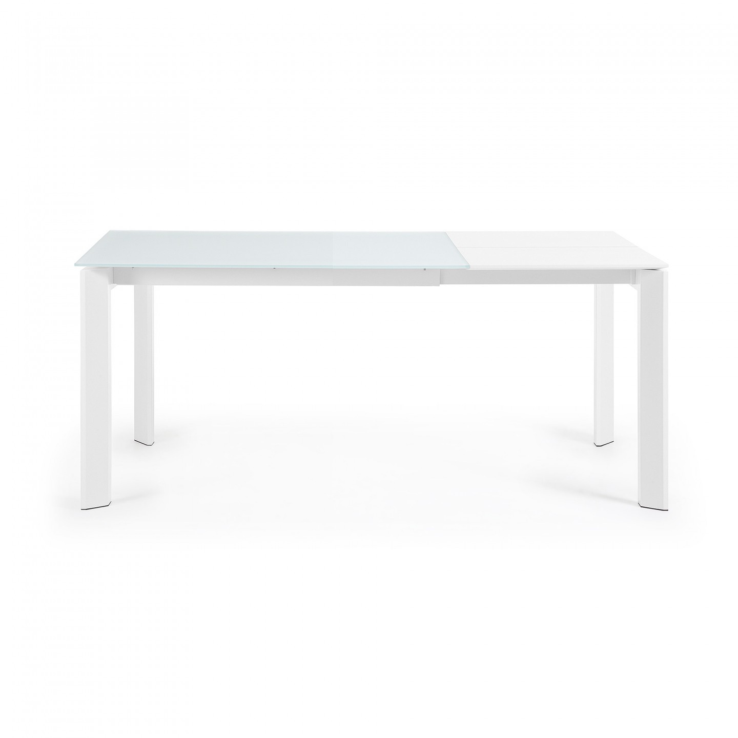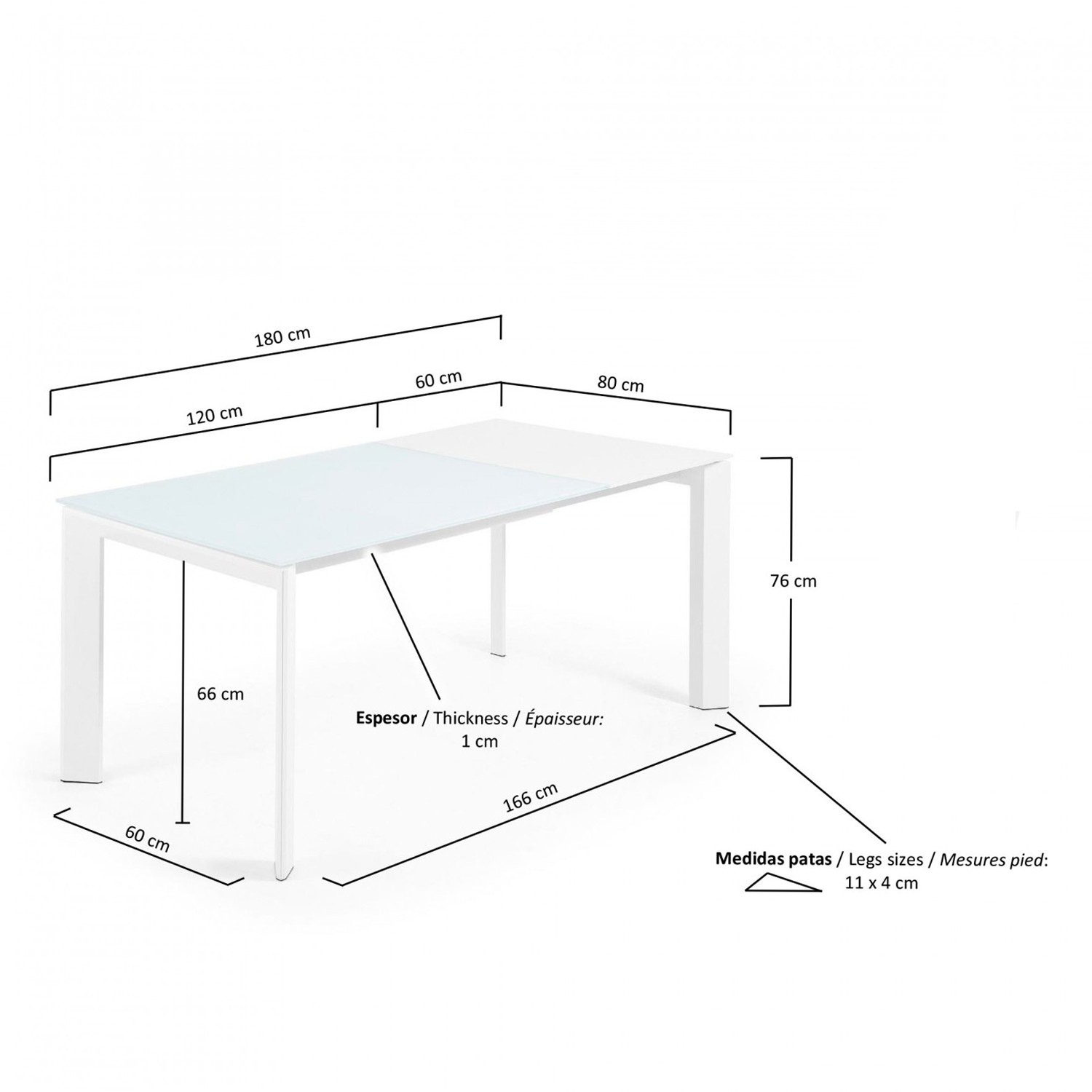 Ante todo, se trata de una mesa con forma rectangular, con unas medidas de 120x80 centímetros, extensible, pudiendo así alcanzar los 180 cm de longitud, compuesta por un sobre de cristal templado en color blanco y una estructura formada por cuatro patas de acero pintadas en el mismo color.