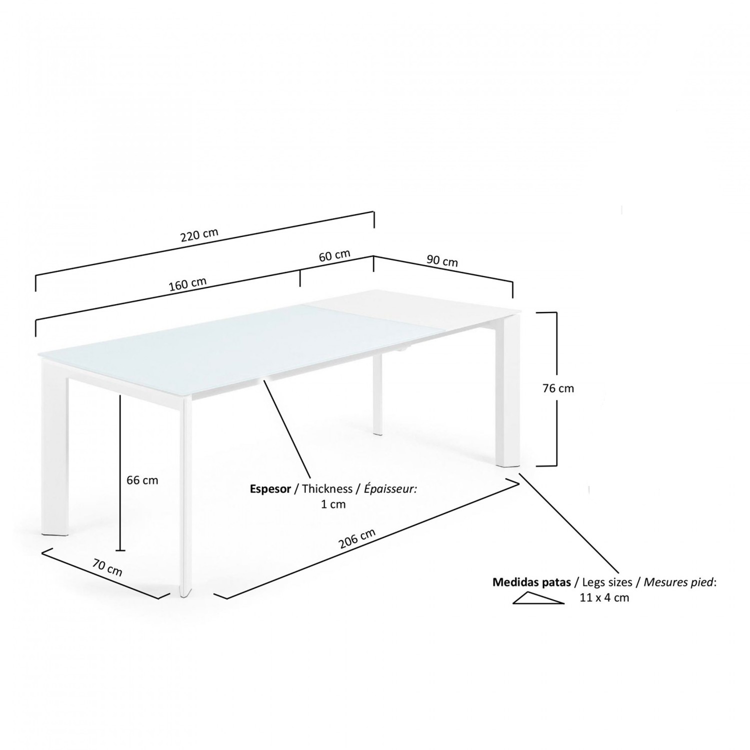 Se trata de una mesa, con unas medidas de 160x90 centímetros, formada por un sobre de cristal templado y cuatro patas diseñadas en acero y acabados en epoxy del mismo color. Una de las ventajas que te ofrece la mesa ROMA es la opción de ser extensible, pudiendo superar los dos metros de longitud total. Gracias a ello, podrás reunir a tu familia o tu grupo de amigos sin problemas, ya que contarás con espacio suficiente para ofrecer una total comodidad.
