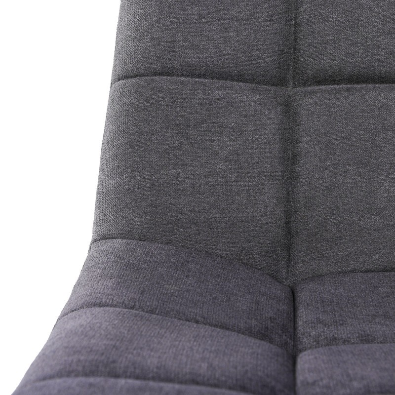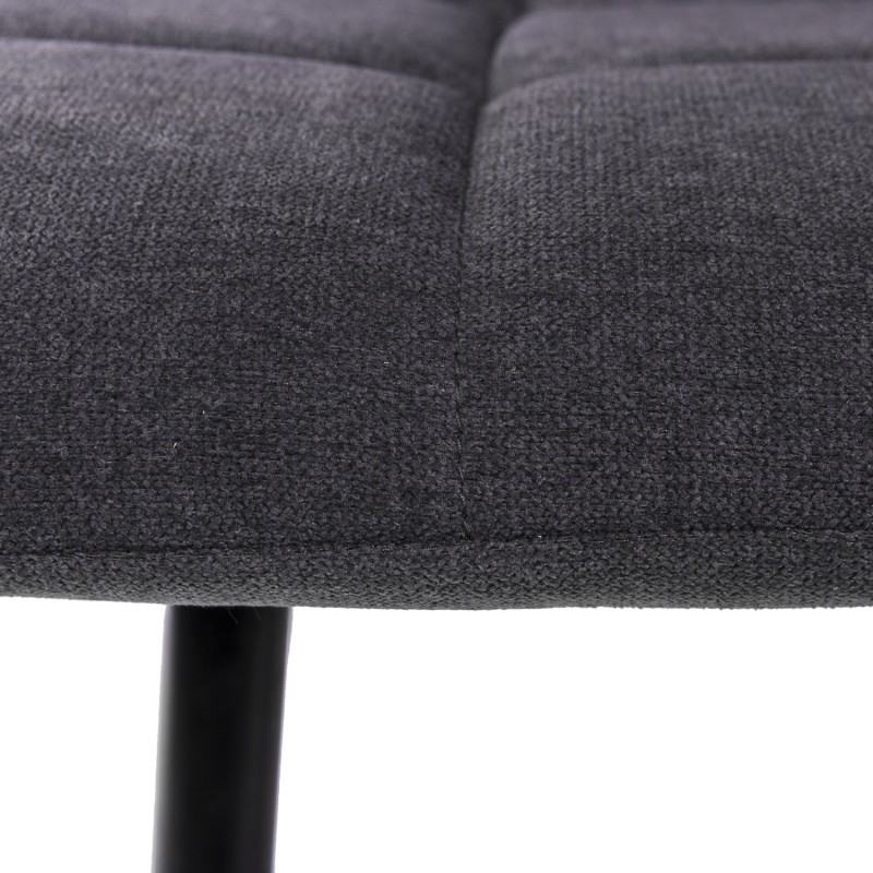 Encontramos, por un lado, un asiento y un respaldo tapizado en tejido acabado en color gris oscuro con pespuntes decorativos horizontales y verticales, creando figuras geométricas cuadradas, y por el otro, cuatro patas cónicas, realizadas en metal negro y que le proporcionan una mayor resistencia.