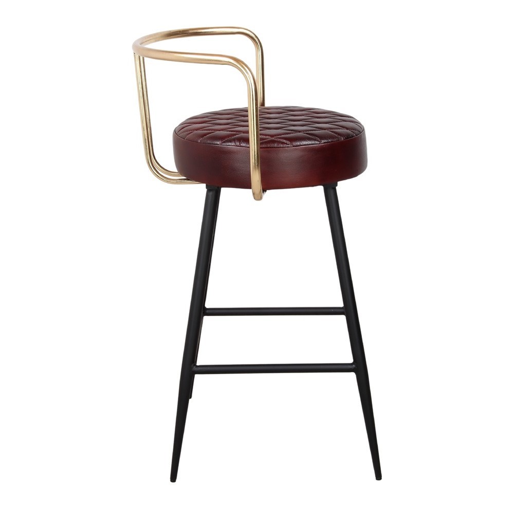 El asiento de forma circular se encuentra tapizado en piel color marrón, como detalle decorativo dispone de unos pespuntes con forma de rombo.