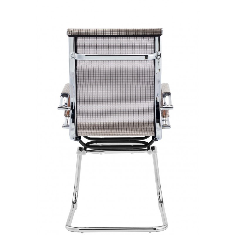 Es una silla realizada en metal tubular reforzado con acabado cromado brillante. Material de gran dureza y durabilidad, con reposabrazos tapizados del mismo color de la silla. La estructura de patas en forma de patín proporciona estabilidad y seguridad total, tapizada enteramente en malla transpirable de alta resistencia, con detalles en color marrón, blanco y negro.