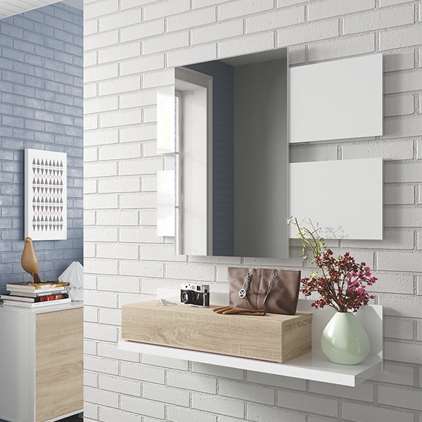 El recibidor ARTI con cajón y espejo, dará a la entrada de tu hogar un toque sofisticado y distinguido gracias a sus líneas modernas. Dispone de un cajón en color roble canadian en el que encontrarás un espacio de almacenaje perfecto para llaves, el mando del garaje o lo que necesites, contrastando con un color blanco que lo hace muy elegante.