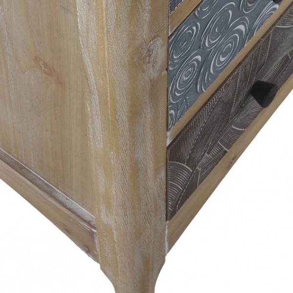 Se trata de una cómoda que le dará a tu hogar un cierto aire rústico-vintage. De forma rectangular, ha sido realizada en DM de abeto en tonalidad desgastado natural para hacer una aire más retro. Dispone de 3 grandes cajones de almacenaje en diferentes tonos marrones y azules con dibujos muy bonitos florales, que portan carácter al mueble, en cambio sus tiradores son en color negro.