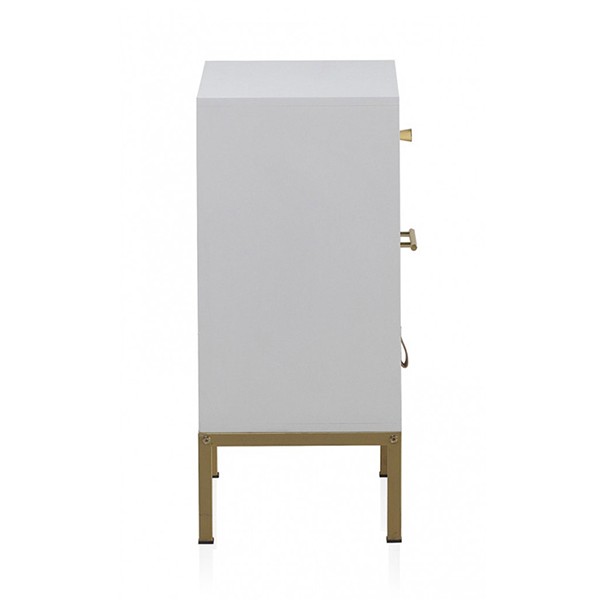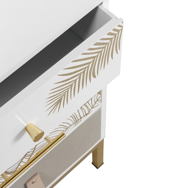 Fabricada en melamina de color blanco con los frontales de los tres cajones de almacenaje decorados con dibujos en tonos dorados y nude a juegos de los pomos metalizados o de polipiel. En cambio sus patas para dar un toque elegante se han realizado en metal dorado.