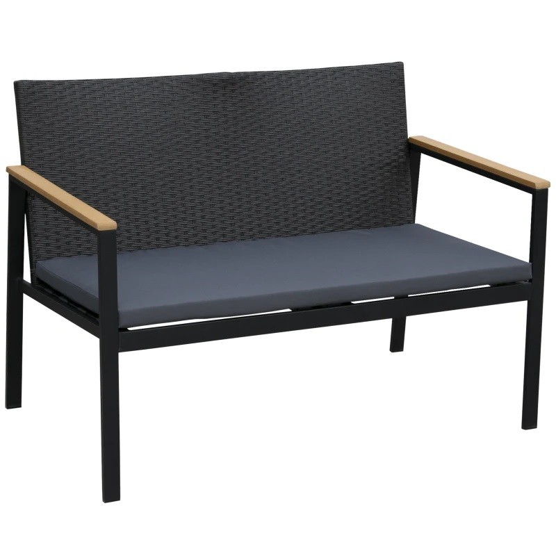Fabricado en estructura de metal en color negro, simulando ratán trenzado con cojín de espuma tapizado en tejido completamente lavable, por lo que podrás extraerlo y mantenerlo como el primer día. Un conjunto apto para el exterior y resistente a los rayos UV. La mesa de centro de estructura del mismo material, tiene sobre de vidrio templado el cual soporta hasta 50 kg de carga.