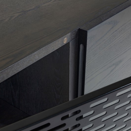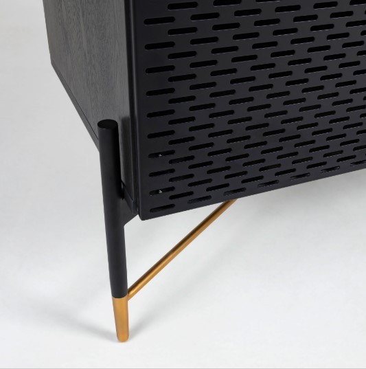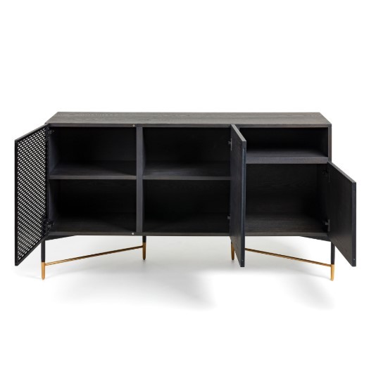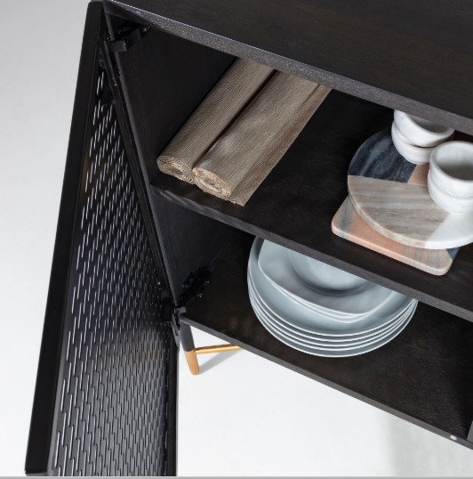 En este momento estás descubriendo el aparador IBIZA, un modelo cuya estructura ha sido realizada en chapa de madera de fresno, y su acabado es en color ceniza. Dispone de diferentes puertas en rejilla de metal, con diferentes compartimentos que nos servirán para poder guardar diferentes objetos (por ejemplo, vajillas). Para terminar, todo ello se eleva ligeramente del suelo gracias a cuatro pies metálicos.