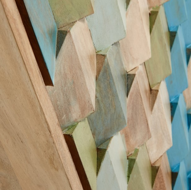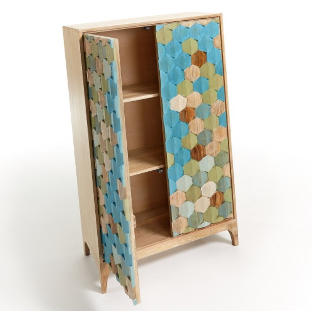 Se presenta en forma rectangular y su diseño se ha realizado en madera de mango macizo natural, mientras que el frontal, es decir las puertas, están talladas en diferentes colores, predominando sobretodo los tonos azules, verdes y marrones.