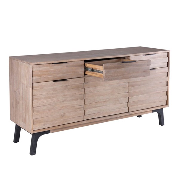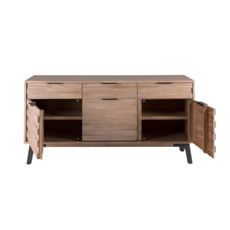 Como solo tenemos palabras bonitas de él, empezaremos por decir que se trata del aparador TAKINU, un gran mueble que se queda a escasos centímetros de los dos metros de longitud. Elegante y sobrio, y de estilo rústico, está diseñado en madera maciza de acacia natural, y le acompañan unos pies de metal en acabado mate.