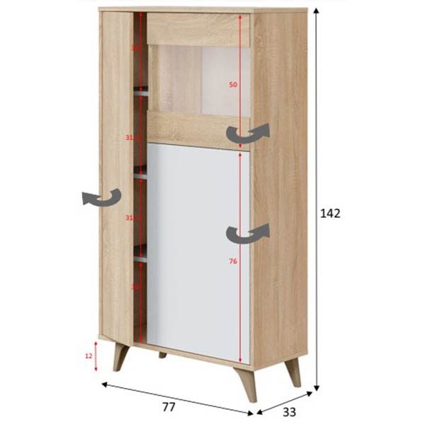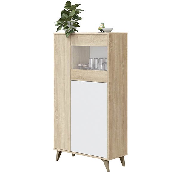 Un modelo de forma rectangular de 142 cm de altura, realizado en melamina de color roble canadian, con 3 compartimentos de almacenaje, una de las puertas es en color blanco artik y otra con cristal. en su interior encontrarás estantes para poder organizar tus objetos. Todo ello ligeramente elevado mediante cuatro patas en ABS, material termoplástico de gran resistencia, en tono roble.