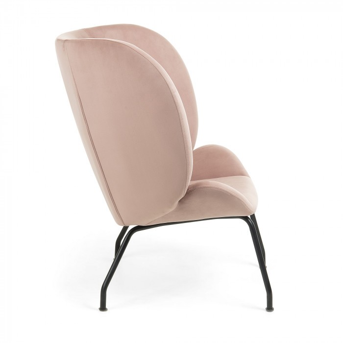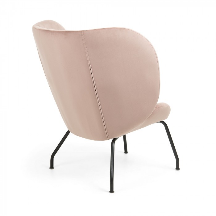 Butaca LEEDS diseñada en tejido aterciopelado de color rosa con botones decorativos y pies de metal negro. Medidas:  Medida alto: 98 cm. Medida ancho: 90 cm. Medida profundo: 82 cm.