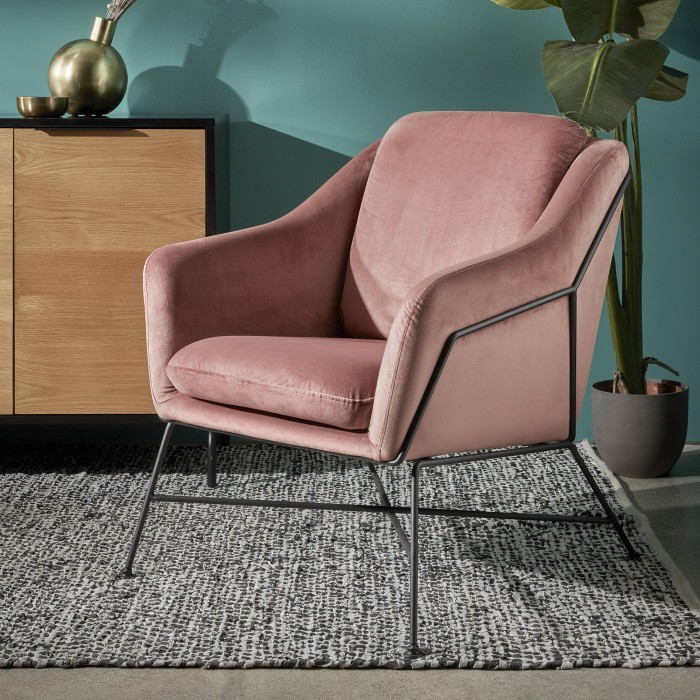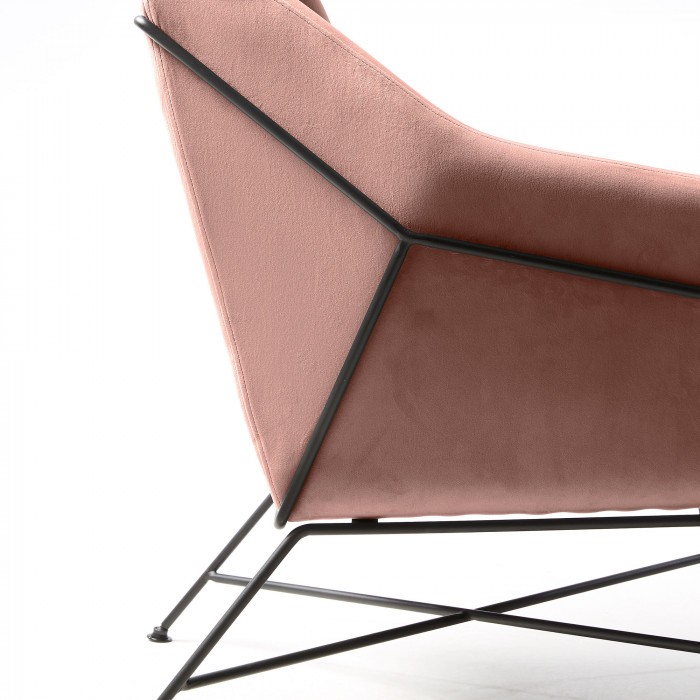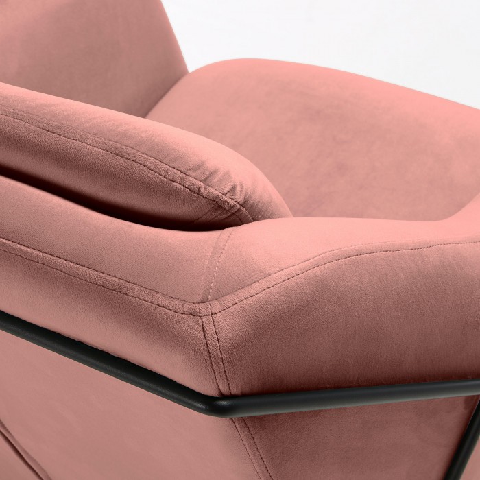 Butaca SPEECH de terciopelo rosa claro con estructura de metal en color negro.