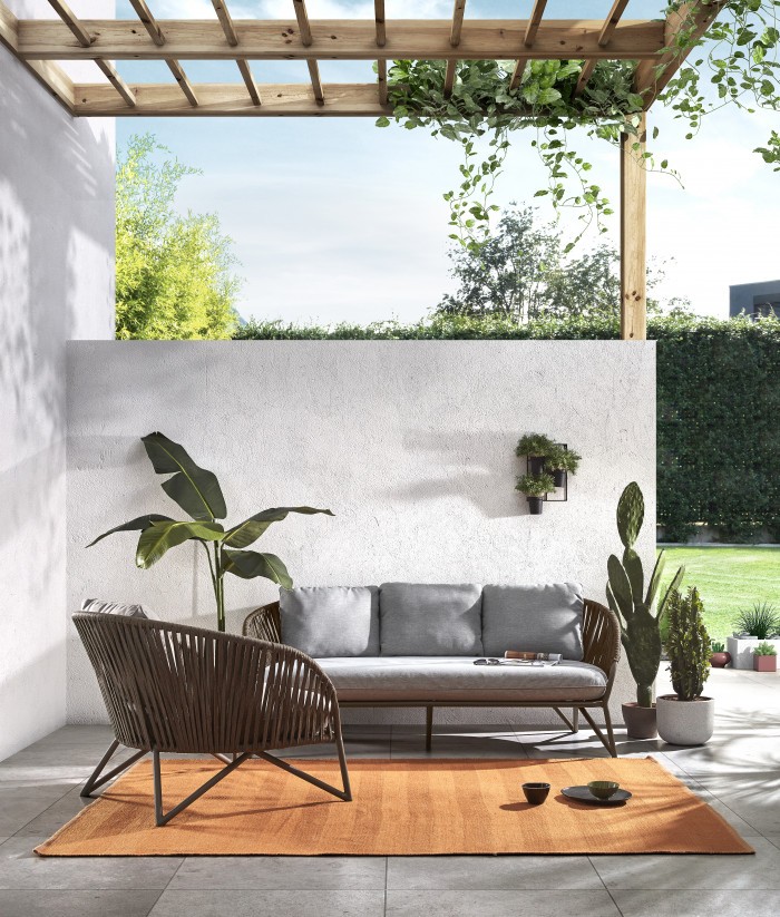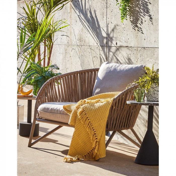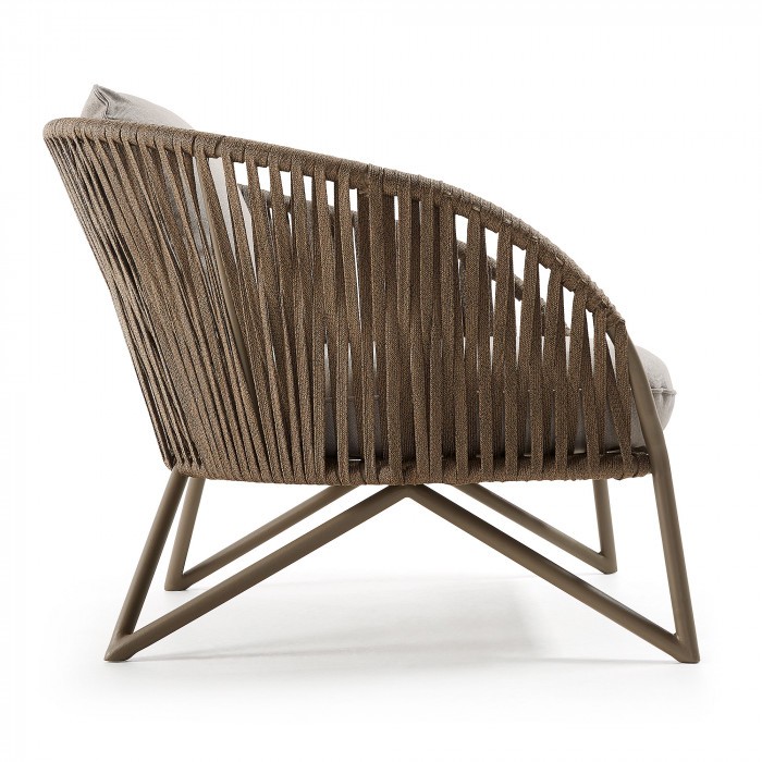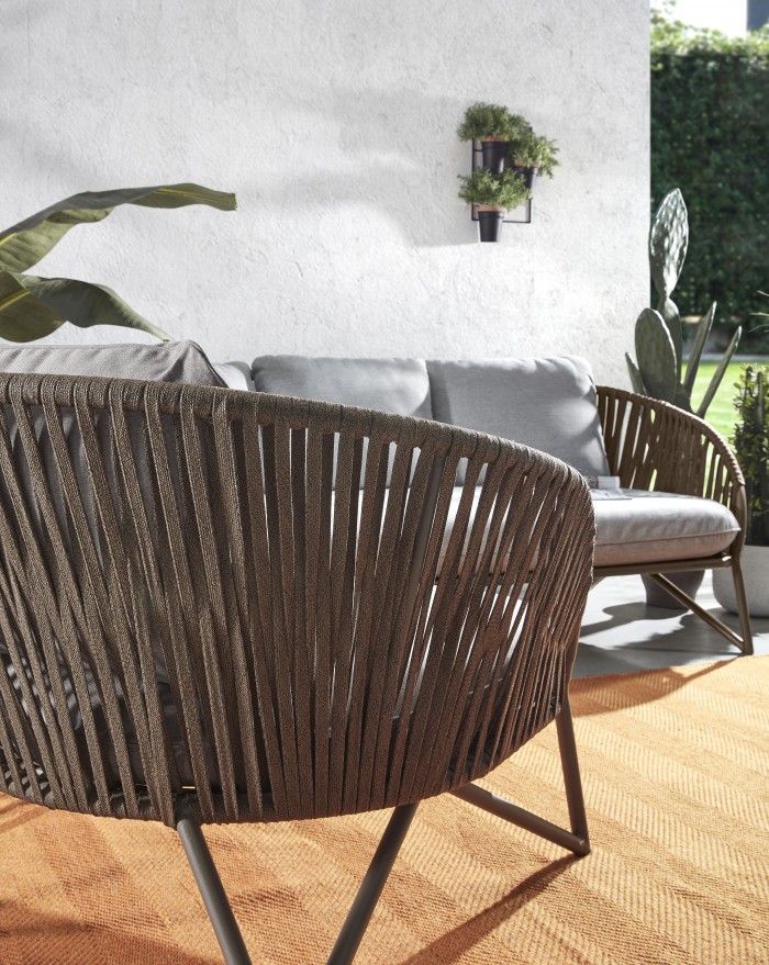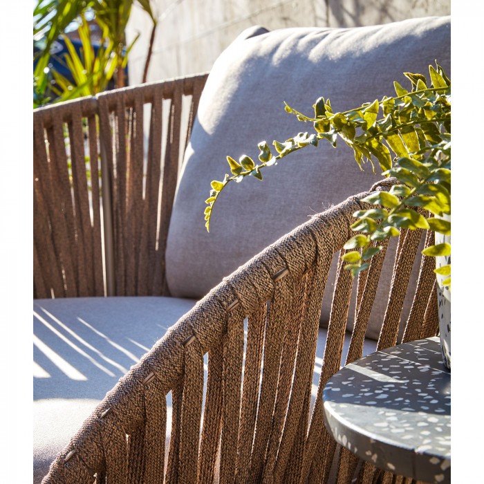 Se trata de un modelo moderno, fresco, para disfrutar junto con los tuyos. Consta de una resistente estructura metálica en acabado de color marrón. Se aprovecha la curvatura de dicha estructura para recubrirla manualmente de cuerda de poliester en color marrón: Ese detalle le da un valor mucho más artesanal y a la vez delicado.