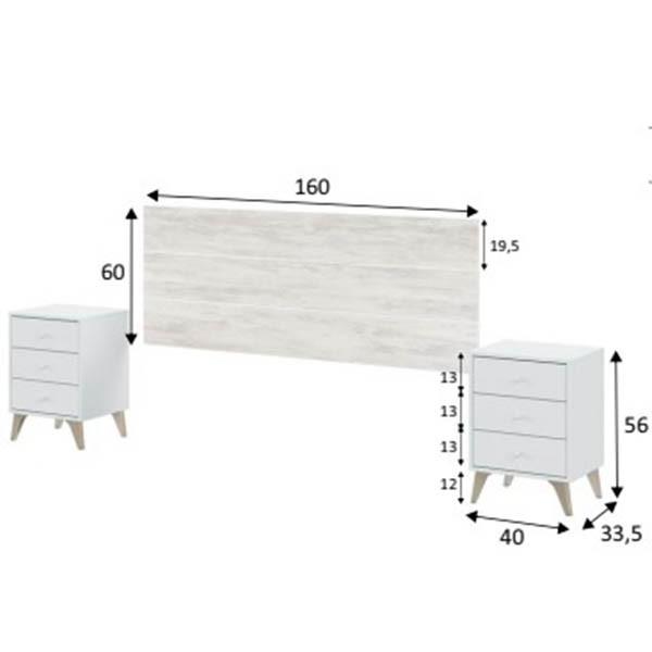 Si quieres tener un dormitorio a la última moda y con un toque clásico pero moderno, no dudes más y hazte con este cabezal con dos mesitas SONNER. Nuestro cabezal insta de dos mesitas con tres cajones cada una, en el que podrás almacenar cualquier tipo de objeto, con una anchura de 40 cm y cuatro patas en la parte inferior. Todo ello realizado en melamina de color blanco y cabezal y patas en tonalidad blanco envejecido. Un modelo idóneo tanto para dormitorios del hogar como de apartamentos, hoteles y hostales, por lo que amueblar tu negocio de hostelería no será un problema. Dispones de la cómoda a conjunto, no dejes escapar esta oportunidad de conseguir un dormitorio perfecto en el que descansar, además de otro mobiliario para completar tu hogar. Fácil montaje en modo kit, con instrucciones y herramientas para su correcto montaje.