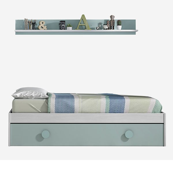 Lo esencial para un dormitorio es la cama en la que descansaremos y recargaremos pilas para todo el día y esta cama hará que tus hijos duerman felices, relajados y además dará un toque de color a la estancia. La cama nido juvenil BAHAR 200x90, consta además de esta maravillosa cama para somier de 200x90, de un cajón en la parte inferior con ruedas que podrás usarlo como almacenaje o bien como cama supletoria para que tu pequeñ@ pueda invitar a una amig@ y de un estante en la parte superior que acabará un conjunto perfecto para el dormitorio. Está fabricado en melamina de color blanco tonalidad alpes y verde acqua para el frontal del cajón y estante. Es ideal para el cuarto de tus hijos, de estilo casual pero con ese toque juvenil que podrás combinar con su armario de tres puertas de la misma colección BAHAR. Fácil montaje en modo kit, con instrucciones y herramientas. No incluye el somier de ambas camas. Se incluye los dispositivos de fijación del mueble a la pared.