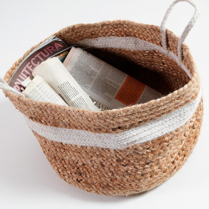 Se trata de un producto muy versátil, puesto que puedes utilizarlo tanto para almacenaje así como para decoración. Fabricado en yute, un producto originario de una planta tropical, está acabado en el color natural de dicho material, recibiendo ligeras pinceladas en color blanco, como por ejemplo las asas, perfectas para coger y transportar.
