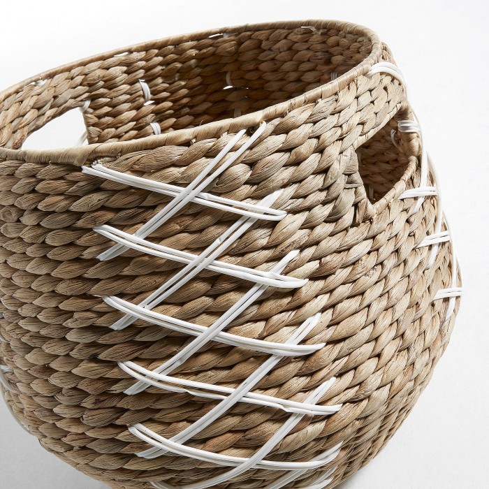¿Que te parece el diseño de la cesta decorativa MIAMOY? Se trata de una cesta realizada en jacinto de agua natural con detalles en plástico trenzado en color blanco. El jacinto de agua es un material que se extrae de una planta acuática conocida por el mismo nombre y que también se utiliza como planta medicinal.