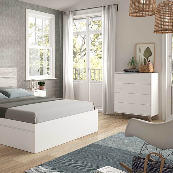 Esta cómoda con 4 cajones SONNER, consta de 4 cajones con tiradores y una gran capacidad de almacenaje, en el que podrás colocar toda la ropa que no te cabe en tu armario. Su color blanco y sus líneas sencillas casarán perfectamente con tu mobiliario.