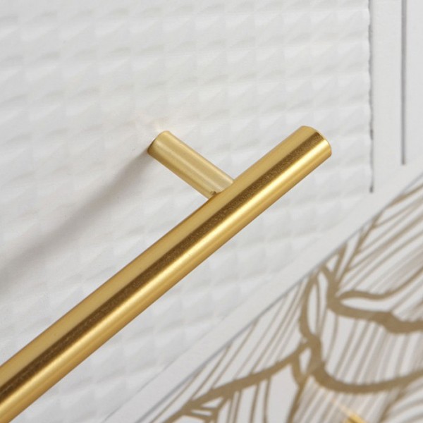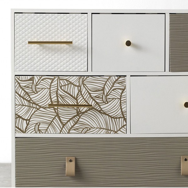 Ésta cuenta con 6 cajones, todos ellos diferentes ya sea por sus medidas o por su acabado. Su armazón está realizado en DM de color blanco, con ciertos acabados en los cajones dorados y tonos marrones tierra. En cambio sus patas son metálicas en color dorado, para combinar con los dibujos boho y parte de sus tiradores, algunos de ellos también en cuero.