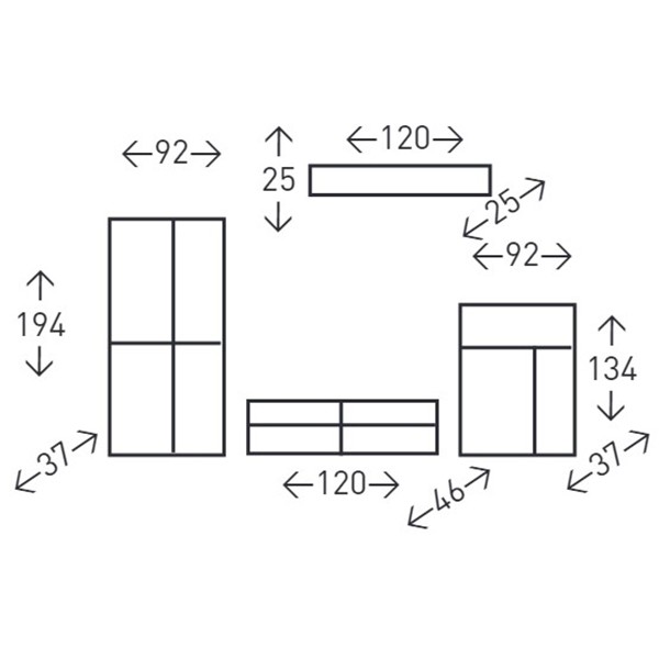 Consta de varios módulos tales como: estanterías, armarios, vitrina y varios espacios con gran capacidad de almacenaje: libros, discos, consola, aparatos electrónicos, vajilla, decoración...