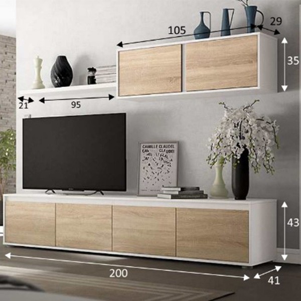 Sencillo, a la vez que elegante este conjunto está fabricado en melamina de color blanco artik y roble canadian sobre patas en termoplástico, material de alta calidad de gran resistencia y durabilidad. Está formado por un modulo para televisión con cuatro puertas, ya sea para apoyarlo o colgarlo en la pared, un estante y un modulo superior con dos puertas.