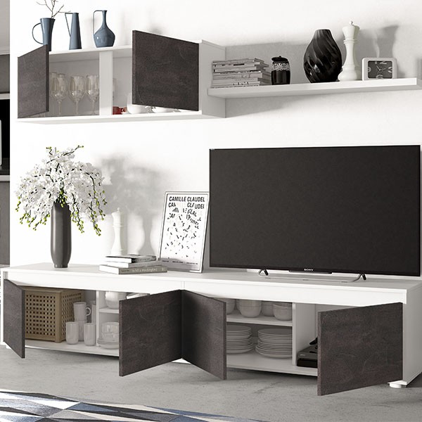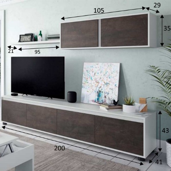 De líneas sencillas, pero con un toque moderno que combina con distintos ambientes, un conjunto que te permitirá espacio de almacenaje para que tu hogar esté siempre organizado y recogido. Dispone de mueble para televisión con cuatro puertas y de modulo superior y estante a juego. Todo realizado en melamina de color blanco artik y marrón óxido con cuatro patas realizadas en ABS.