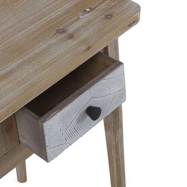 Se trata de un modelo diseñado en DM de madera contrachapada de abeto en tono natural, para darle un mejor acabado final y antiguo la madera se ha decapado para otorgarle un acabado envejecido. Dispone de 3 cajones: dos en tono blanco con motivos decorativos y uno liso en su centro con pomos en color negro.