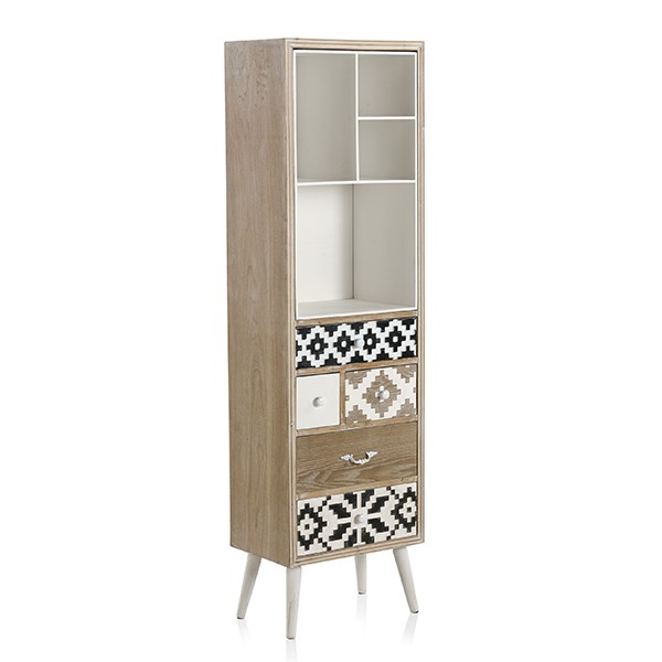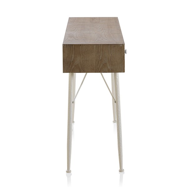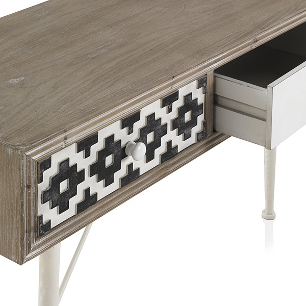 De estilo rústico, la consola POTOSÍ esta formada por una estructura realizada en MDF chapado de abeto natural, y le acompañan cuatro patas de madera de abeto acabadas en color blanco. Dispone de tres cajones con tallados distintos así como tiradores variados en cada uno de ellos.