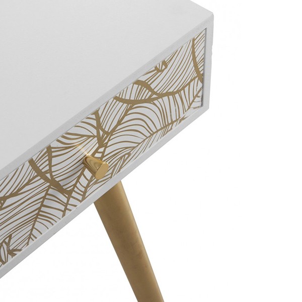 Fabricada en melamina de color blanco con los frontales de los dos cajones decorados con dibujos en tonos dorados a juego con sus pomos y patas metálicas del mismo color. Todo ello diseñado para estancias de ambientes nórdicos, para aportar un toque chic, o mid century, clásicos o modernos.