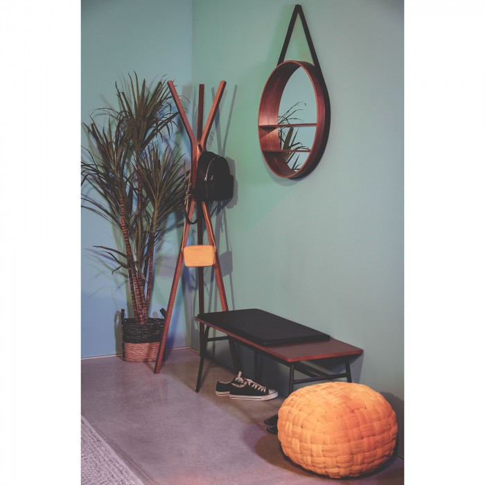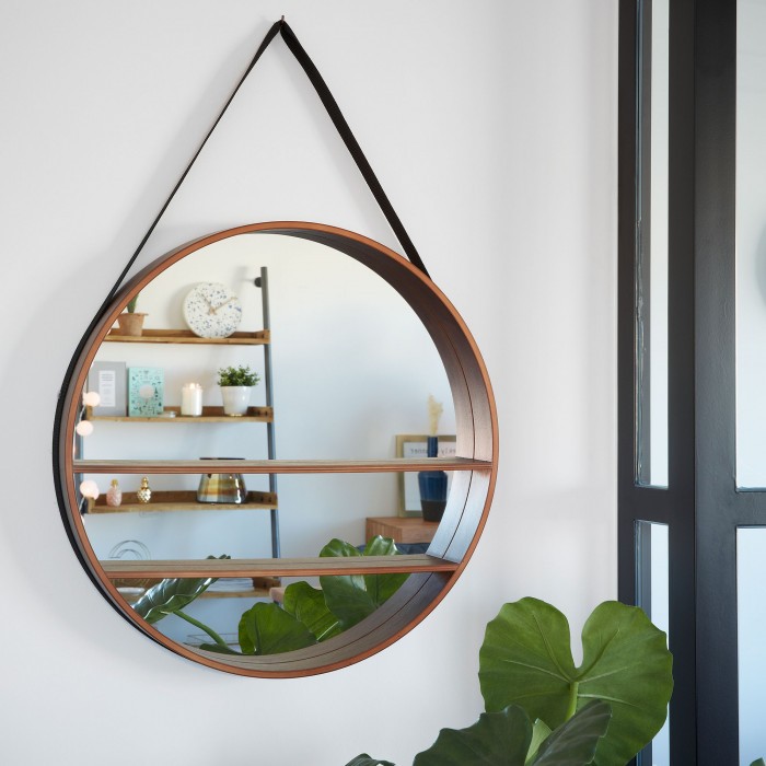 Por ello te presentamos uno de grandes dimensiones, el espejo BEKELE. Redondo en su forma, cuenta con un diámetro que prácticamente alcanza los 60 centímetros y consta de un gran cristal redondo rodeado por un marco en madera chapada de nogal, mismo material que se utiliza para los dos estantes que también dispone.