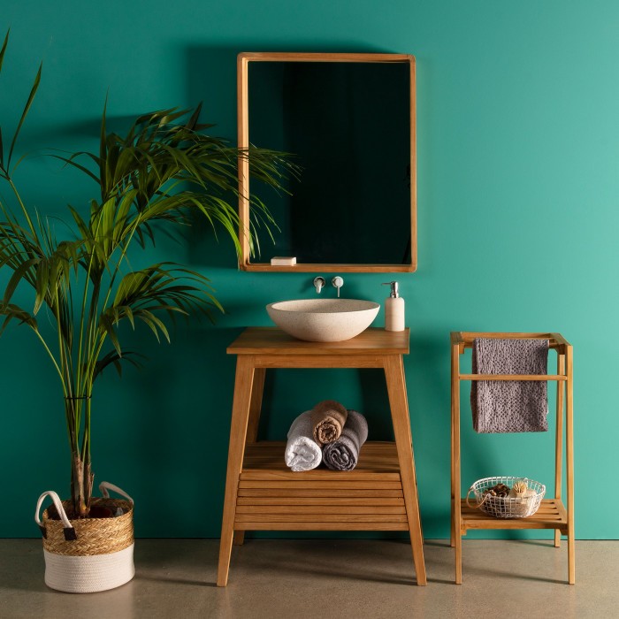 Por ello te presentamos el espejo SMILE, un modelo presentado en forma rectangular, y que consta de un cristal de grandes dimensiones rodeado por un fino marco de madera de teca en acabado natural.