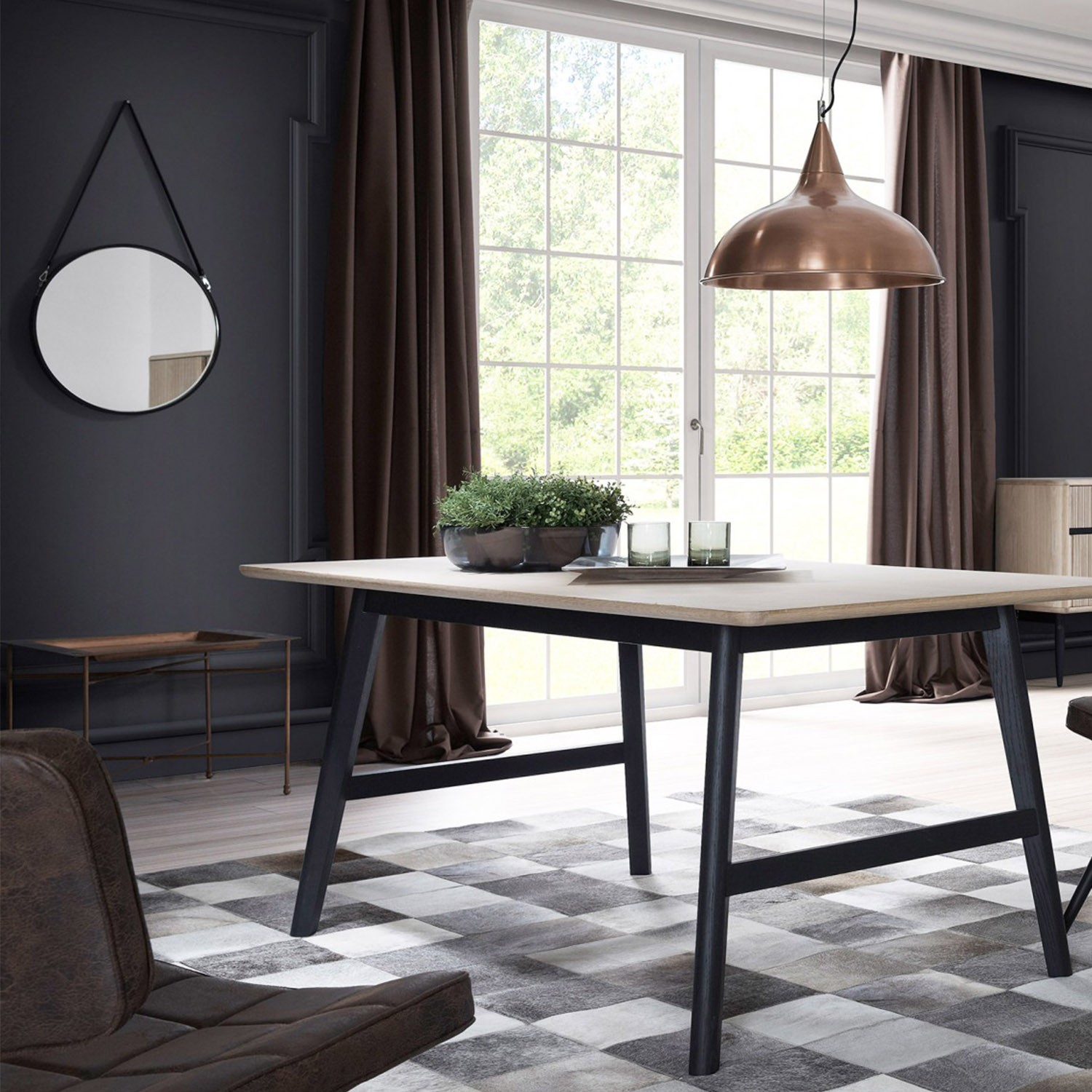 Se trata de un producto que combina diferentes materiales. Para empezar el cristal. Este, va rodeado por un marco metálico en color negro. Por último, la innovadora manera de colgarlo, mediante una asa diseñada en piel.
