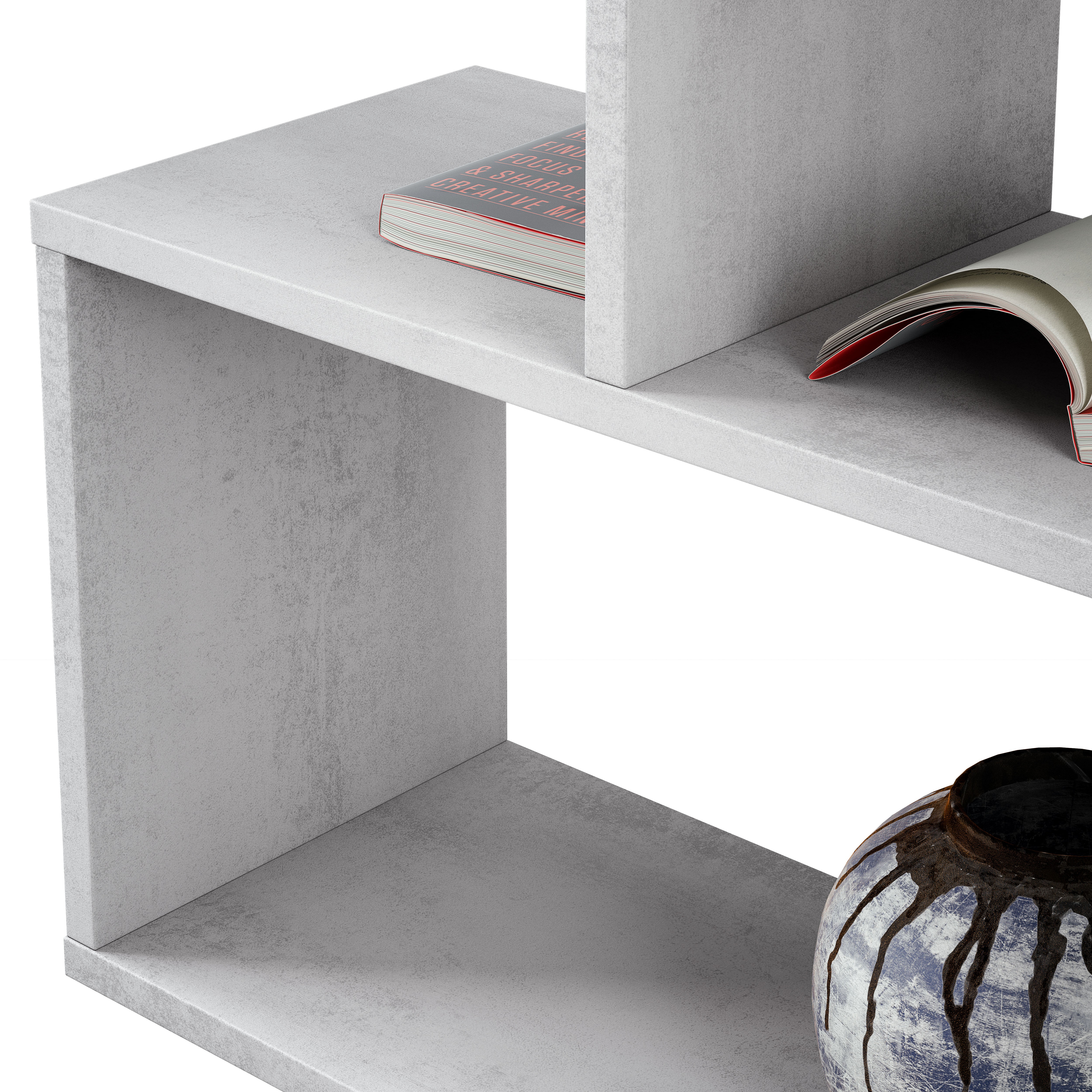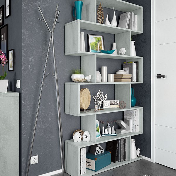 Está fabricada en melamina, en color gris cemento, aportará a tu hogar un tono elegante y moderno. Dispone de seis huecos asimétricos en los que colorar tus objetos decorativos preferidos o tus libros, fotos o CD'S. Casará perfectamente con tu estilo decorativo y no pasará desapercibido. Viste a tu pared tan perfectamente como lo harías contigo mismo. Puedes colocarla en el suelo directamente o colgarla en la pared.