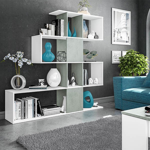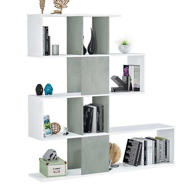 Fabricada en melamina de color blanco y tapas en gris cemento, con estructura en forma de zig-zag para darle un aire más desenfadado a tus estancias. Tendrás mucho espacio para organizarla, ya que dispone de cuatro estantes con cubículos para que puedas esconder o no lo que desees: fotos, libros, objetos de decoración.