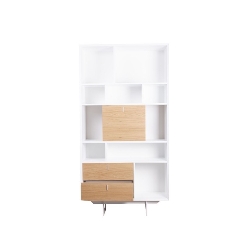 En esta ocasión vas a conocer la estantería alta MUTAI, un modelo ideal para ambientes nórdicos y modernos, diseñado en DM lacado en acabado de color blanco, al que le acompañan dos cajones y una puerta que podrás mover según tu criterio, todo ello realizado en chapa natural de madera de roble. Además, dispone de múltiples compartimentos en los que libros o decoración van a quedar de maravilla.