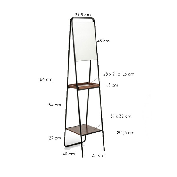 Su estructura está diseñada en metal acabado en color negro, y cuenta con dos estantes colocados a diferentes alturas, de gran utilidad, puesto que en ellos puedes dejar el teléfono, el monedero o las llaves. Además dispone de un cristal rectangular en el que darte los últimos retoques antes de marcharte de casa.