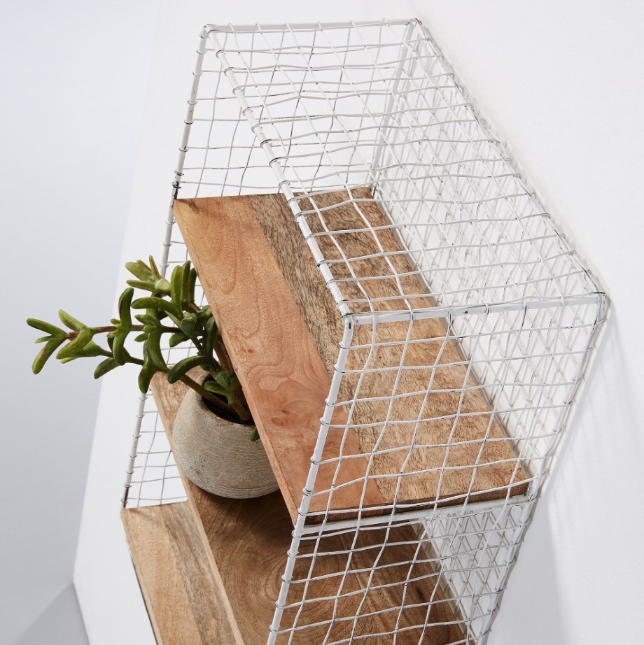 Nos referimos a la estantería de pared CELTIC, un modelo de forma rectangular diseñado en rejilla de metal en color blanco rodeando toda su parte exterior. En su interior, encontramos tres estantes de madera natural, y que nos servirán para colocar enseres personales o decorativos, para potenciar todavía más su belleza.