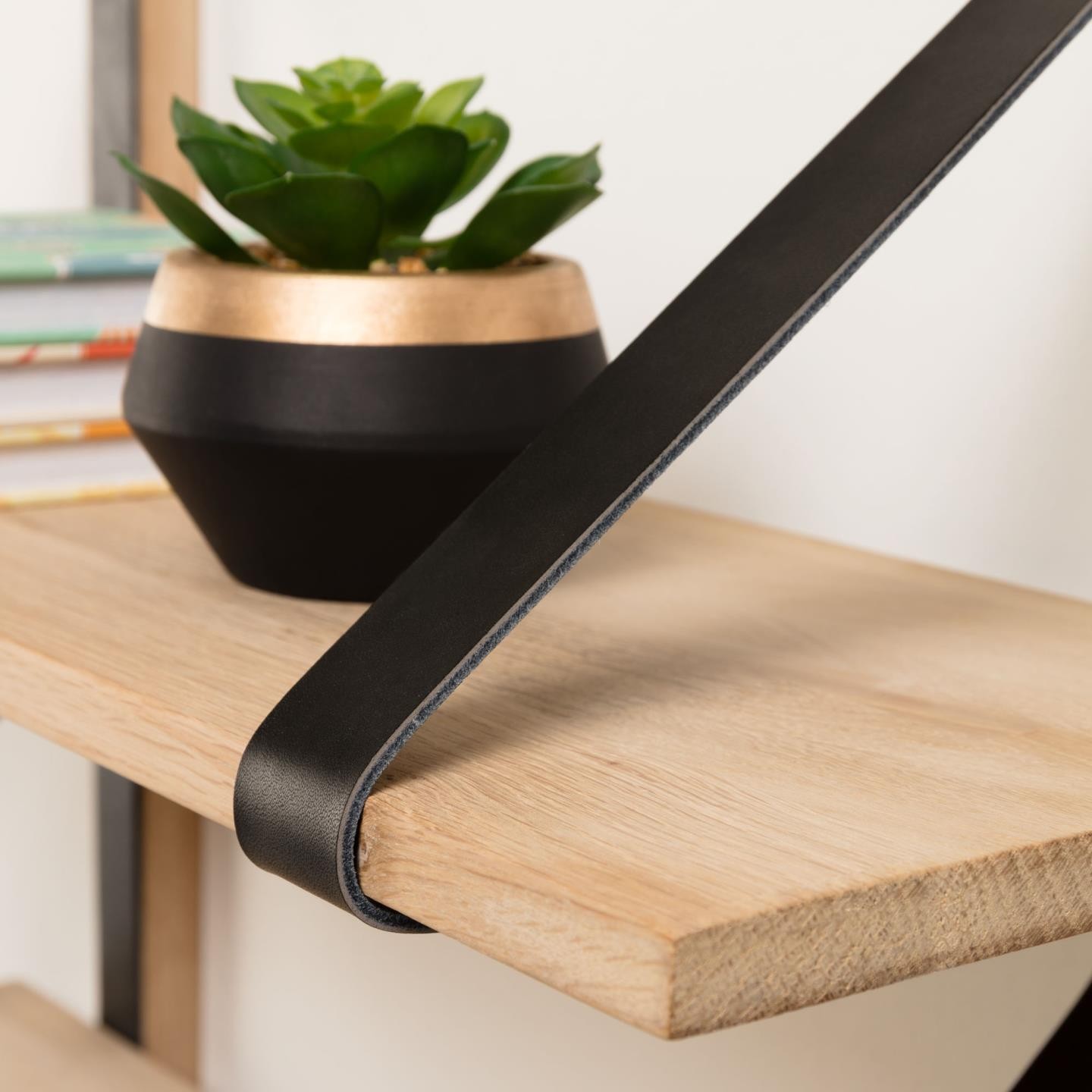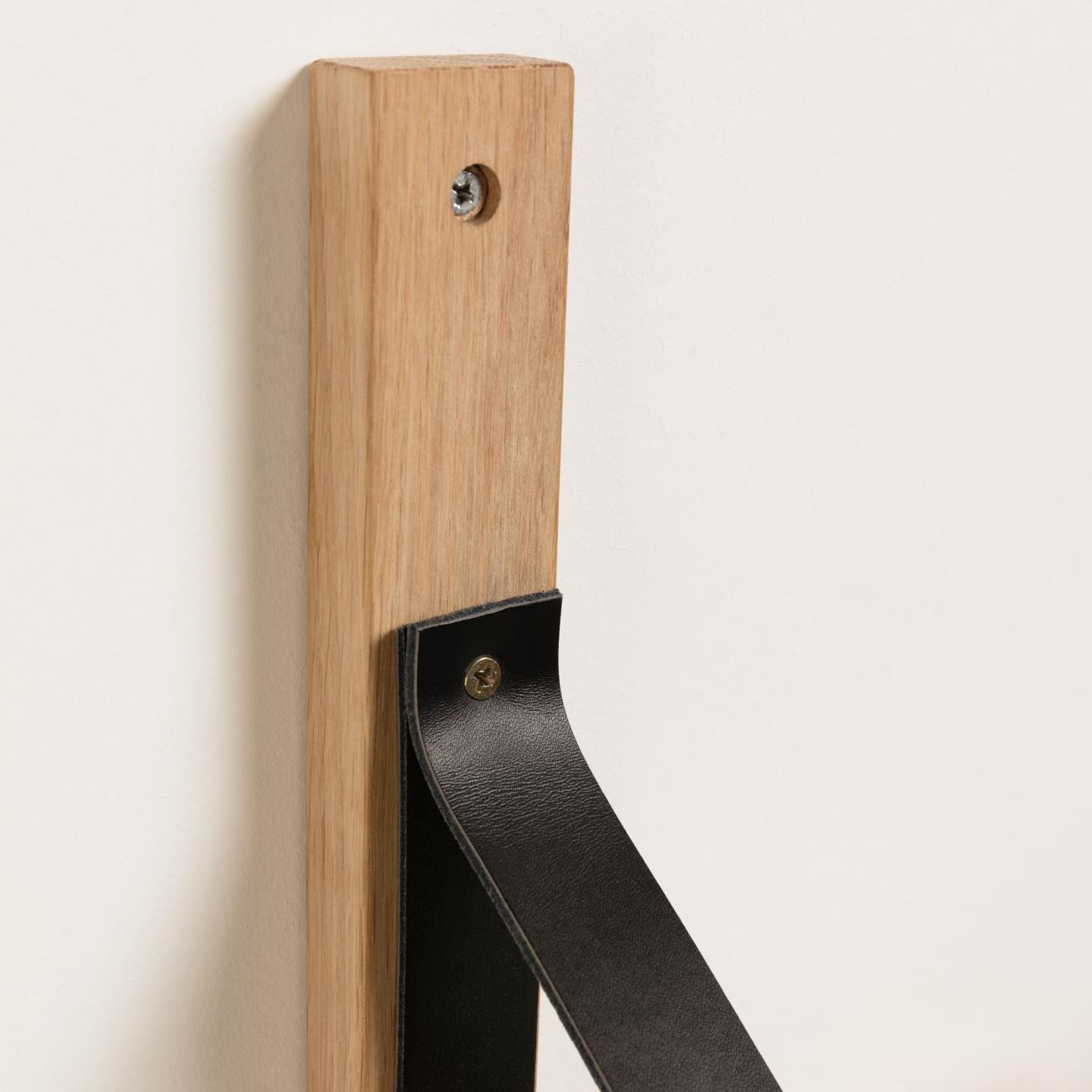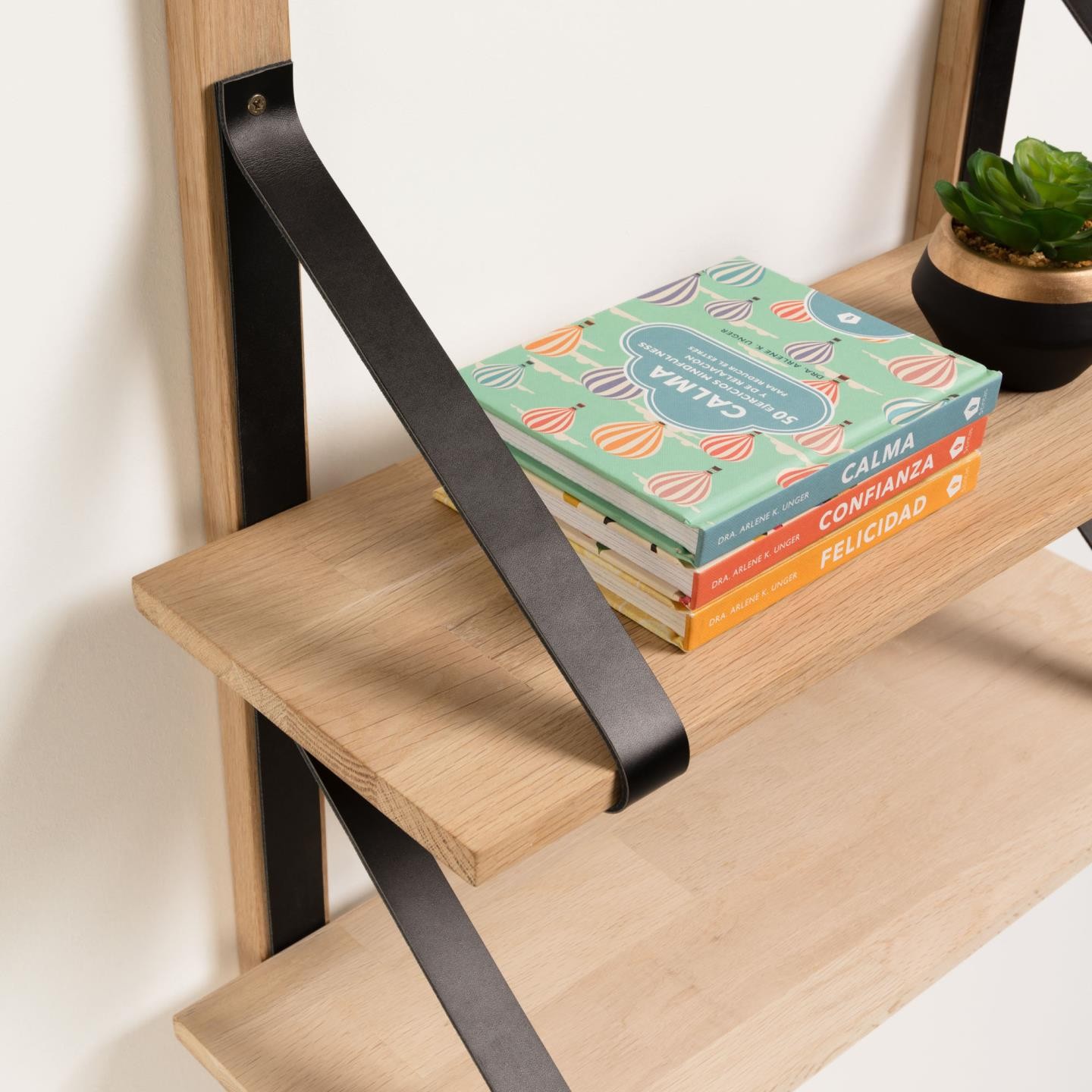 Y una de ellas es con la estantería de pared TEMPTATION, formado por una estructura que deberás fijar en la pared, con dos estantes colocados uno debajo del otro. Todo ello realizado en madera maciza de roble natural. En cada extremo de dichos estantes encontramos asas de piel en color negro que le aportan mayor estabilidad.