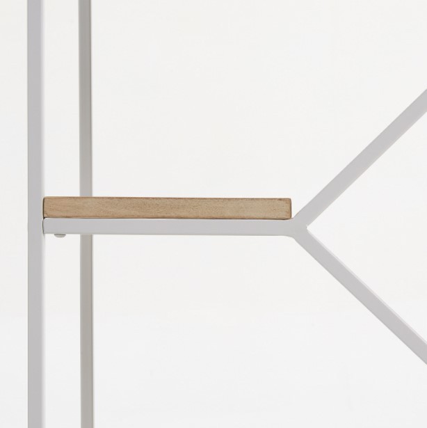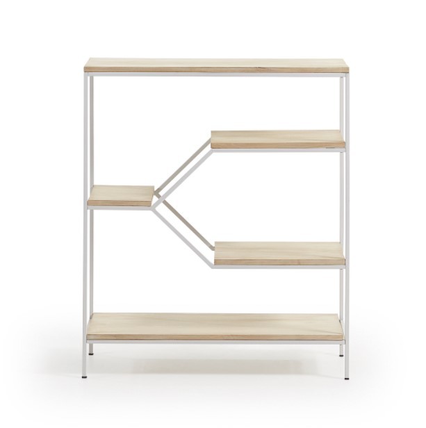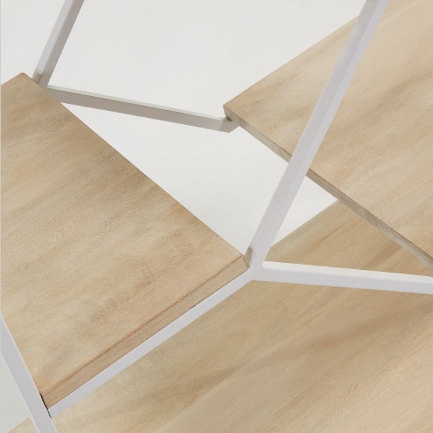 Pero vamos a pasar a hablar de su diseño. Se presenta en forma rectangular y con una altura que no llega a alcanzar el metro de altura. Cuenta con una estructura diseñada en metal acabado en color blanco y varios estantes de madera de mango maciza natural de diferentes tamaños y colocados a diferentes alturas.
