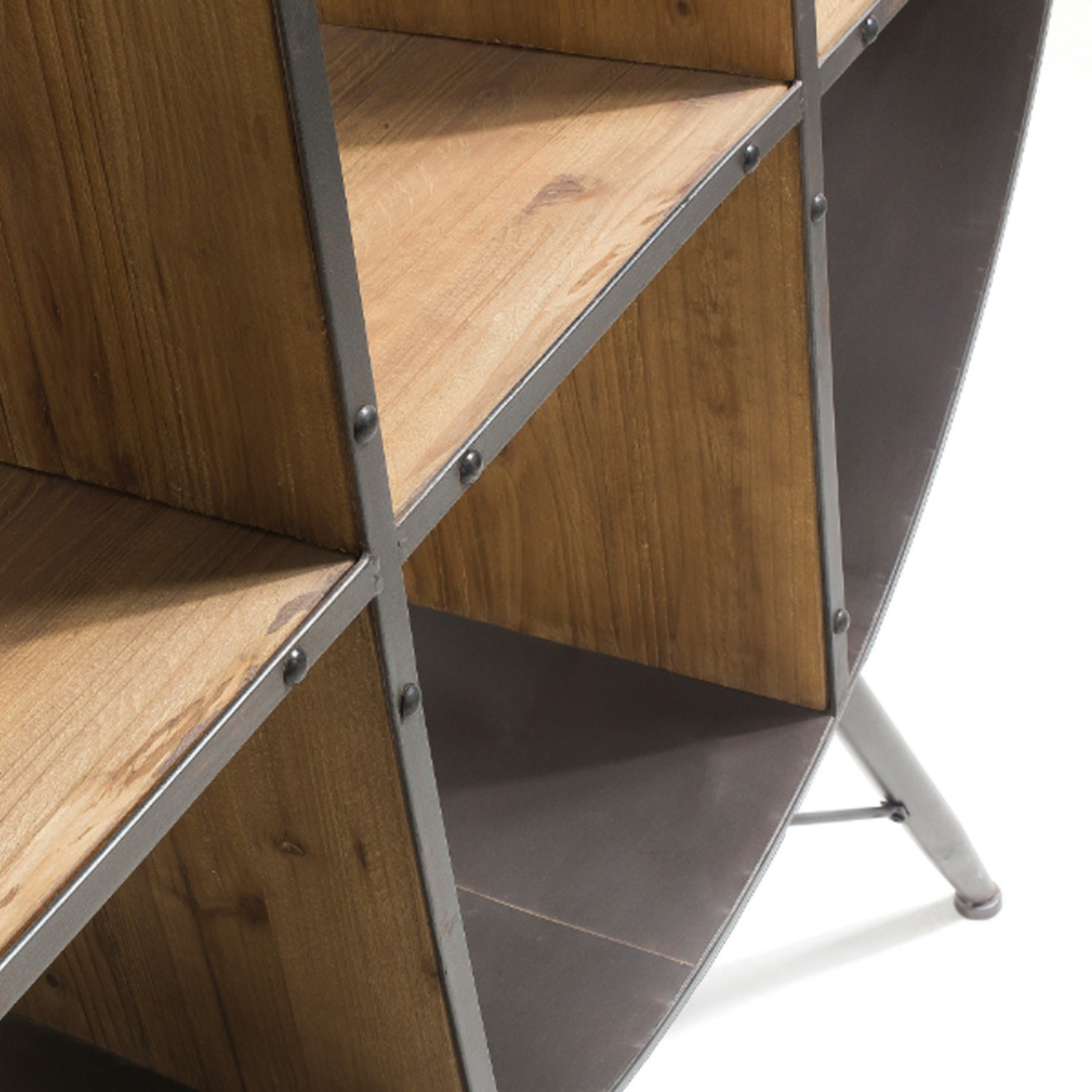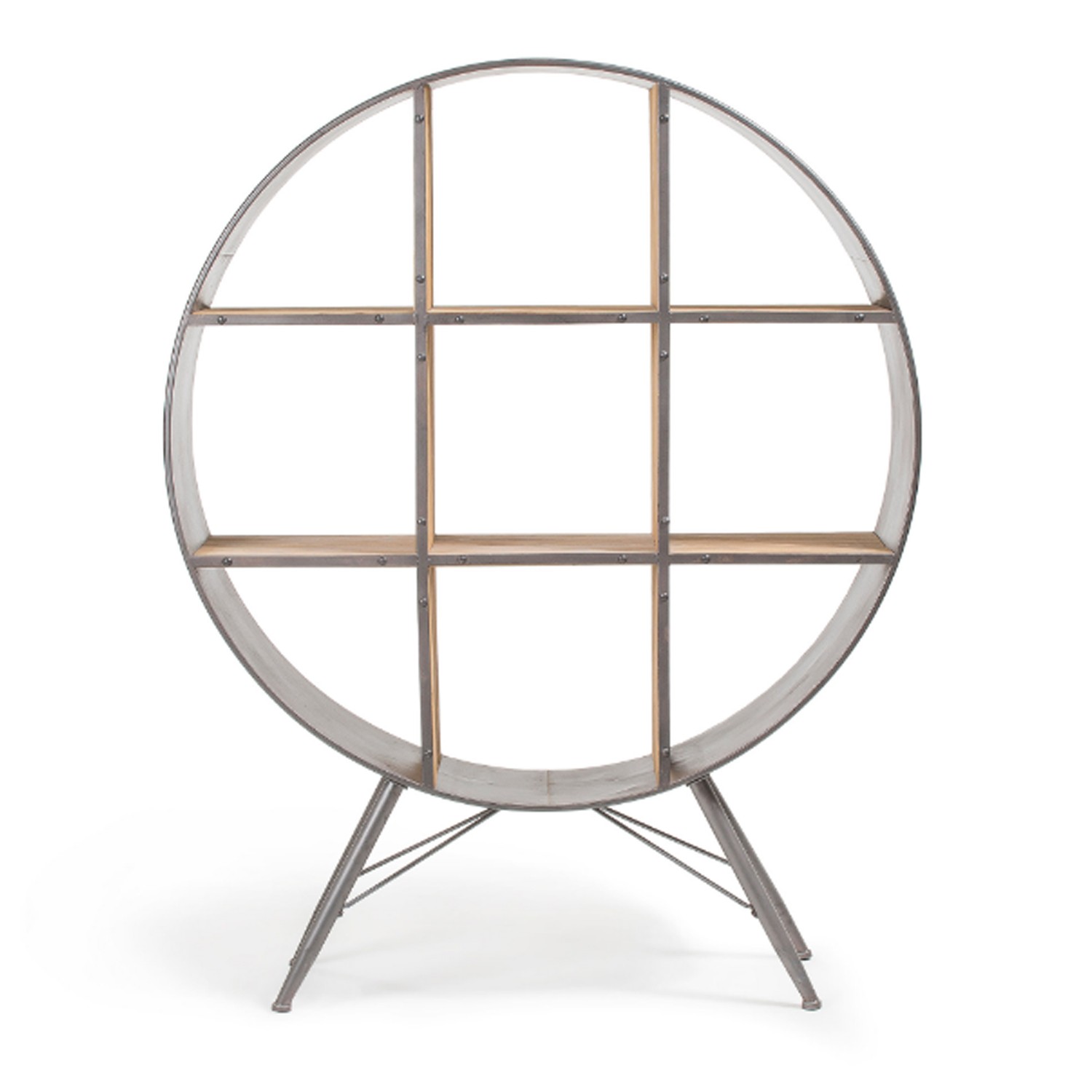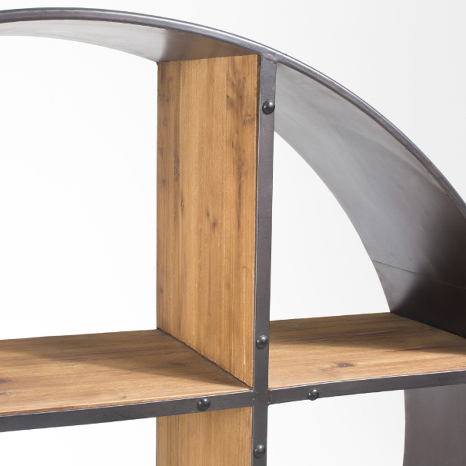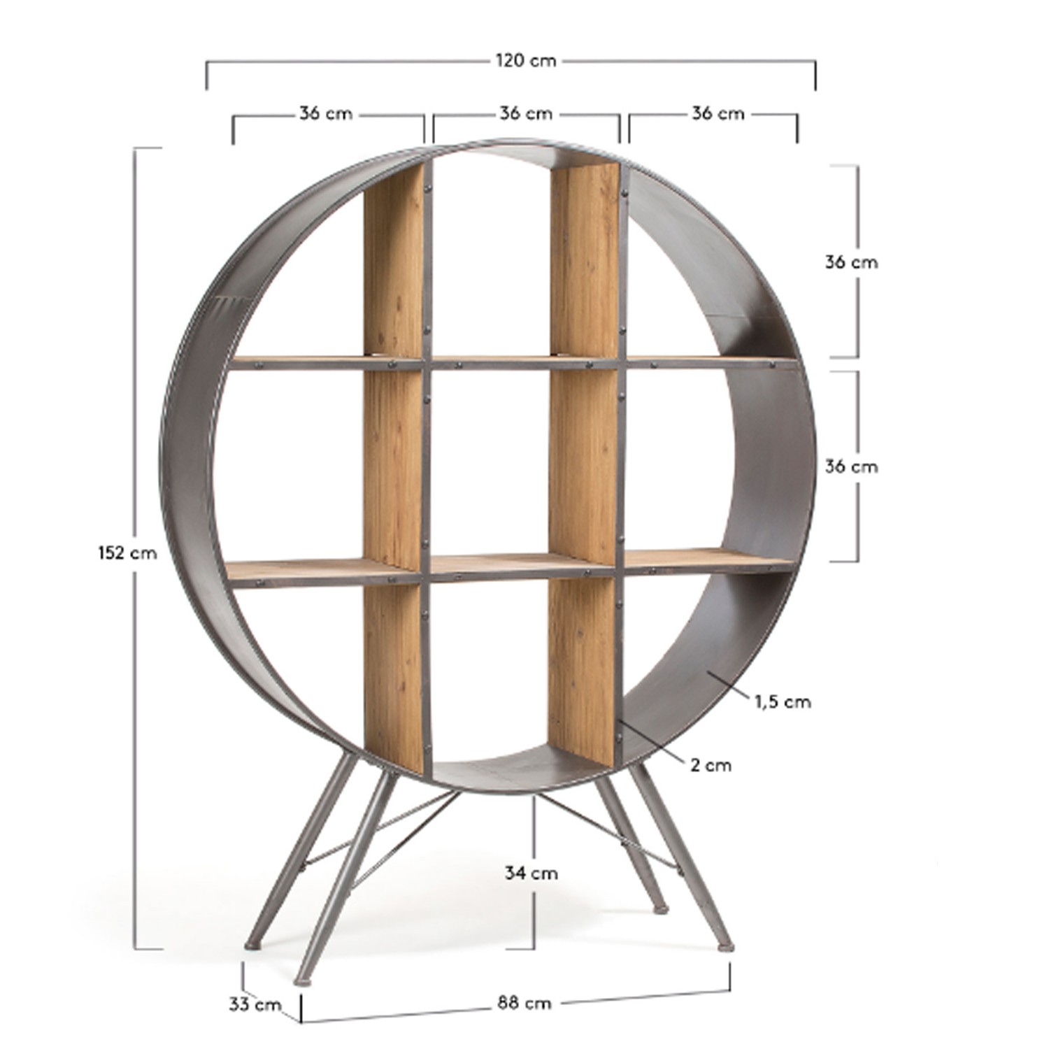 Su nombre es HEIAL. Su diseño consta de una circulo de metal en color negro y en su interior, maderas colocadas de forma horizontal y vertical, creando casilleros, unos cuadrados y otros en forma triangular. Y todo esto se sostiene mediante cuatro patas también metálicas, aportando firmeza y seguridad.