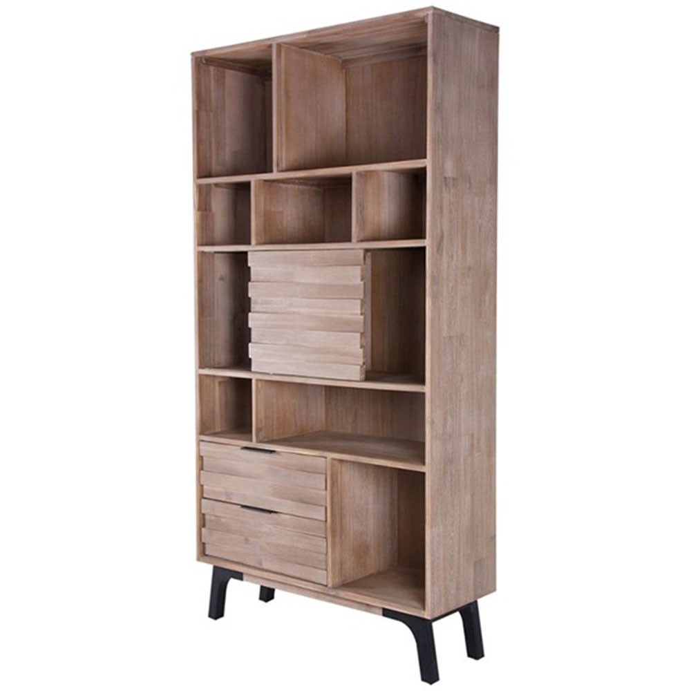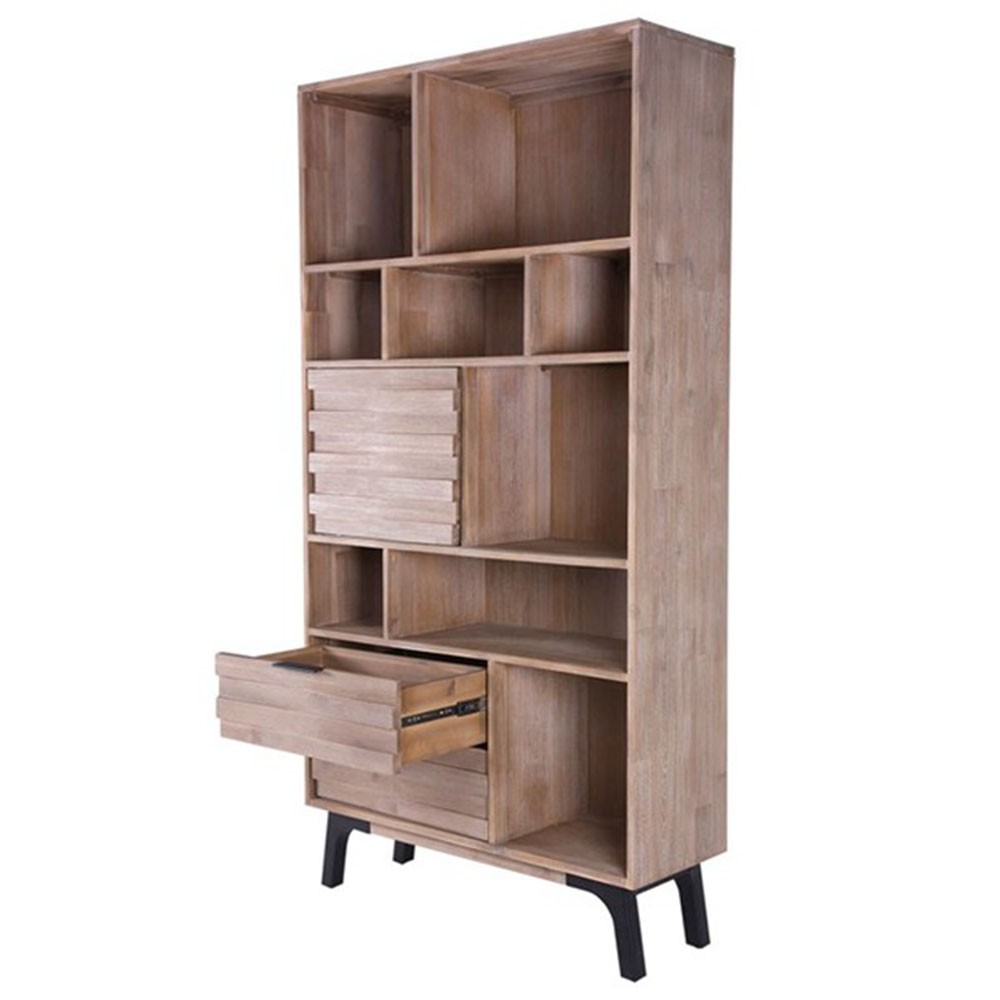 Y es que la estantería TAKINU nos ofrece juego, pudiendo, en ella, guardar muchas cosas gracias a sus grandes dimensiones. Está realizada en su totalidad en madera de acacia maciza en acabado natural, a excepción de las patas que la elevan ligeramente del suelo, que son metálicas. Cuenta con diferentes huecos de tamaños variados, así como de un par de cajones que, como ya hemos comentado anteriormente, nos facilitan el poder mantener nuestra casa en orden.