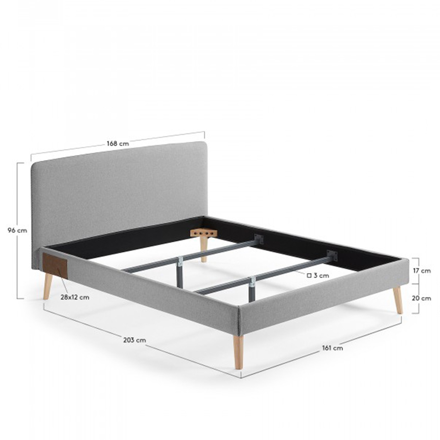 Estructura de cama ROJIM tapizado en tejido de color gris. Medidas:  Medida alto: 76 cm. Medida ancho: 168 cm. Medida profundo: 203 cm.
