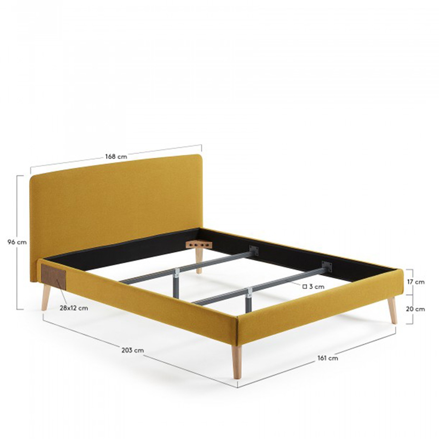 Estructura de cama ROJIM tapizado en tejido de color mostaza. Medidas:  Medida alto: 76 cm. Medida ancho: 168 cm. Medida profundo: 203 cm.