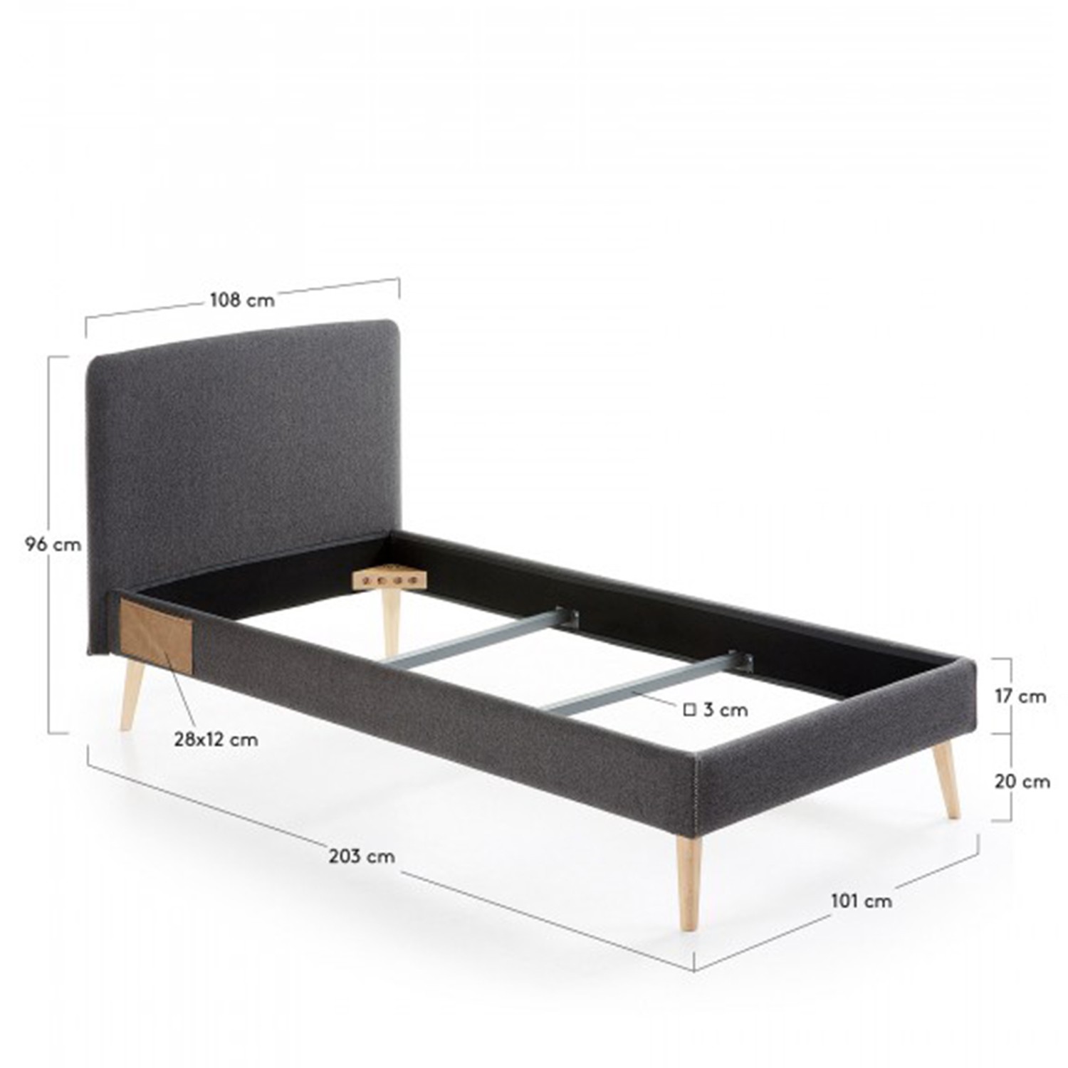 Estructura de cama ROJIM tapizado en tejido de color antracita. Medidas:  Medida alto: 76 cm. Medida ancho: 108 cm. Medida profundo: 203 cm.