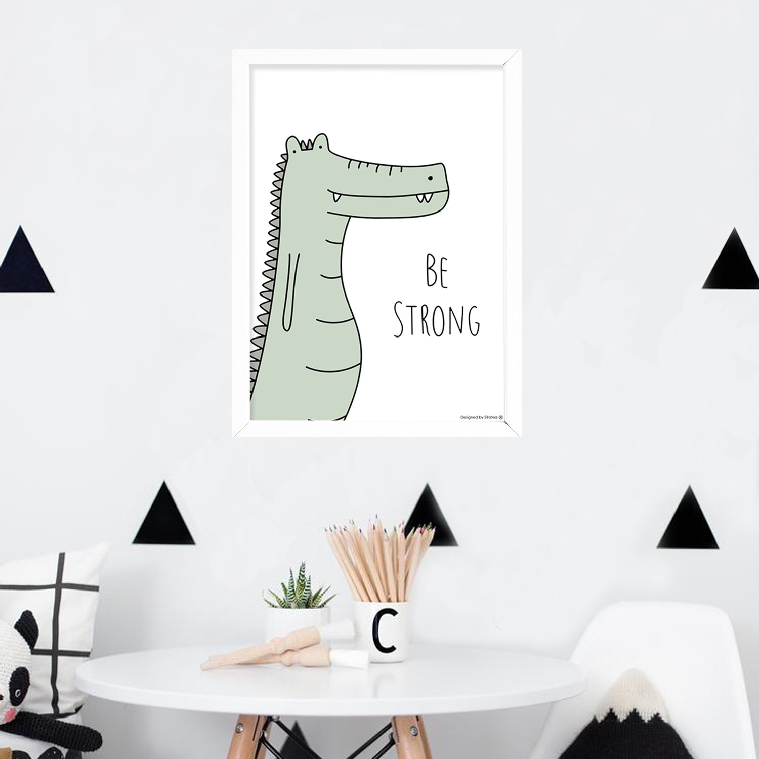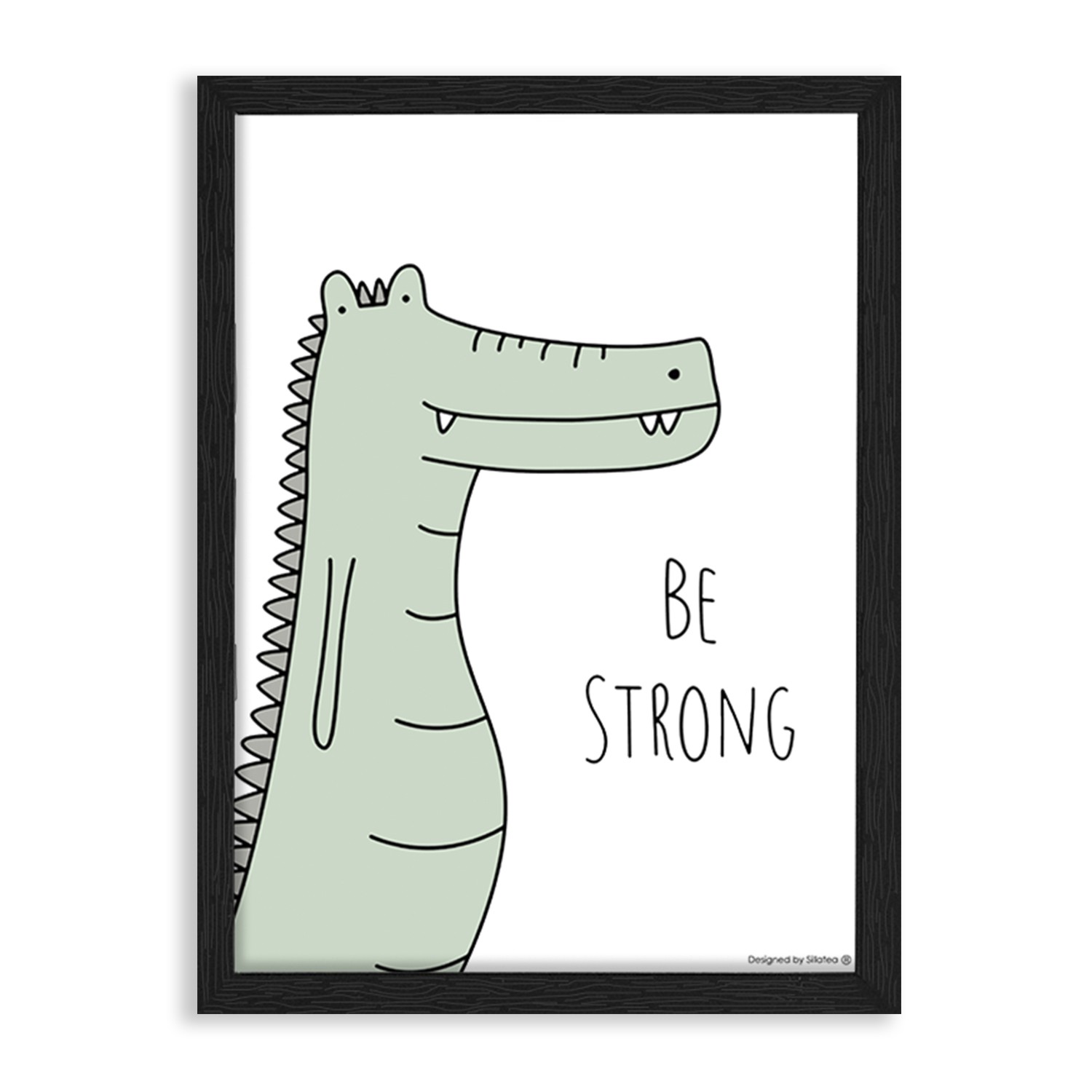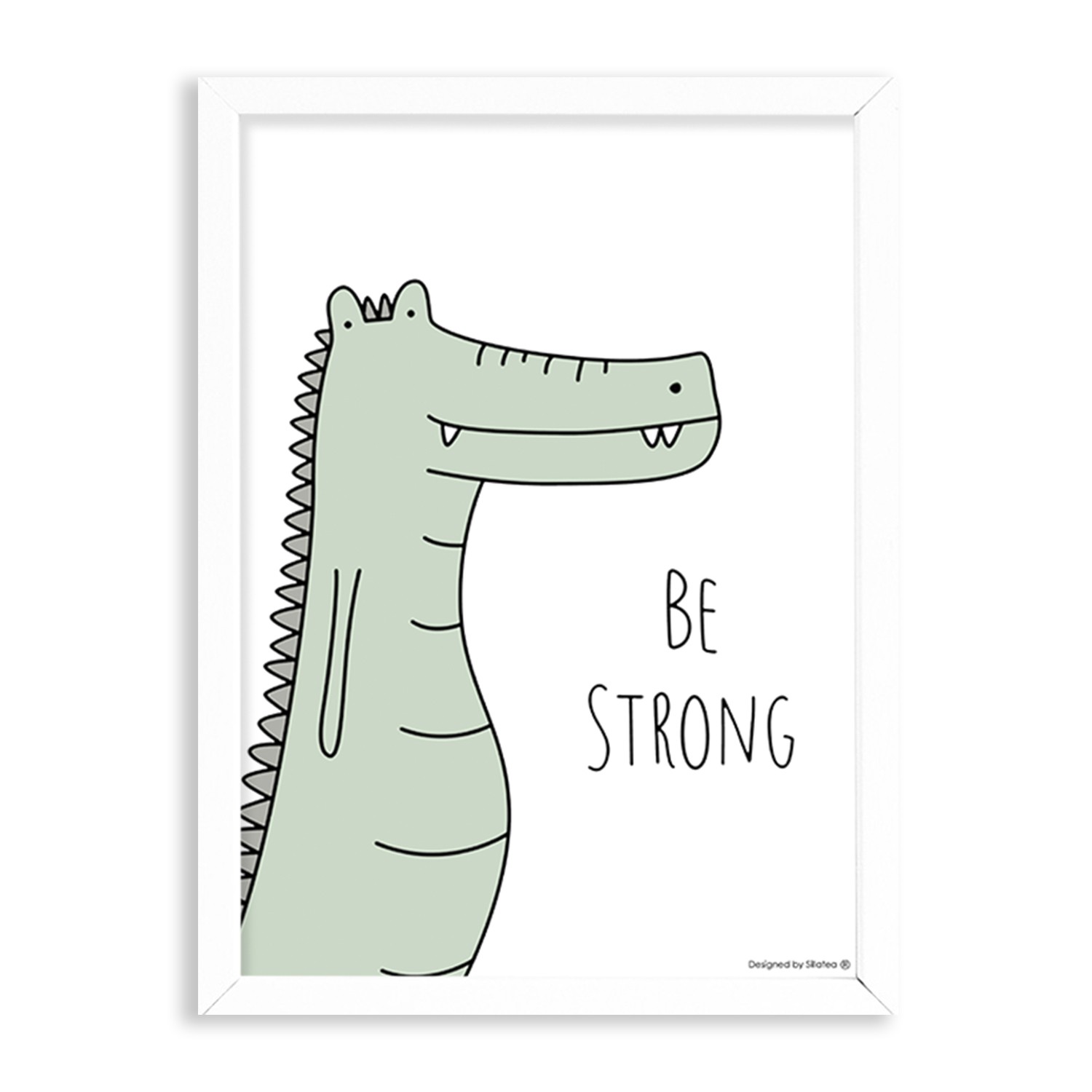 La lámina con marco BABY COCODRILO está diseñada para colgar en la pared de forma bien sencilla, pero también puedes apoyarlo en estanterías o mesas, puede ser una buena opción como elemento decorativo de sobremesa.