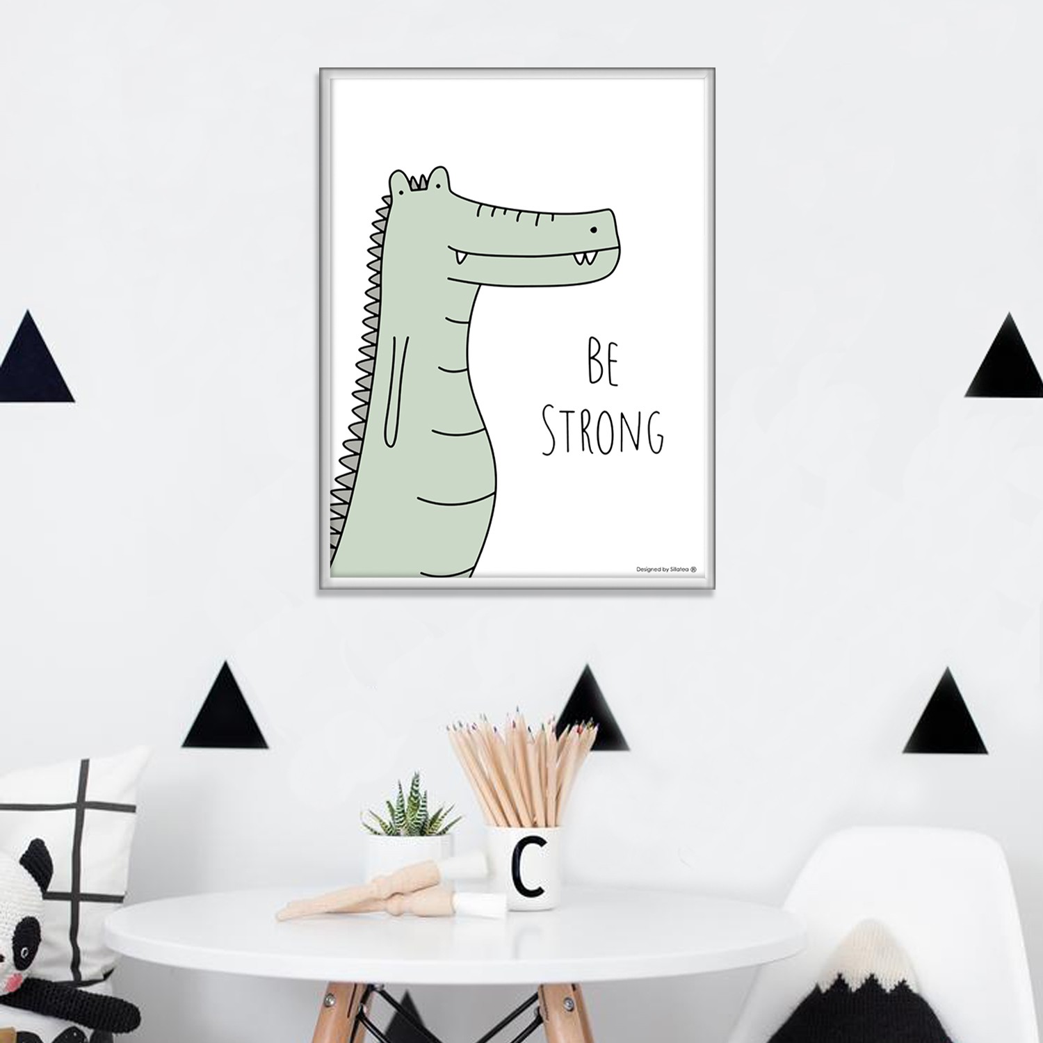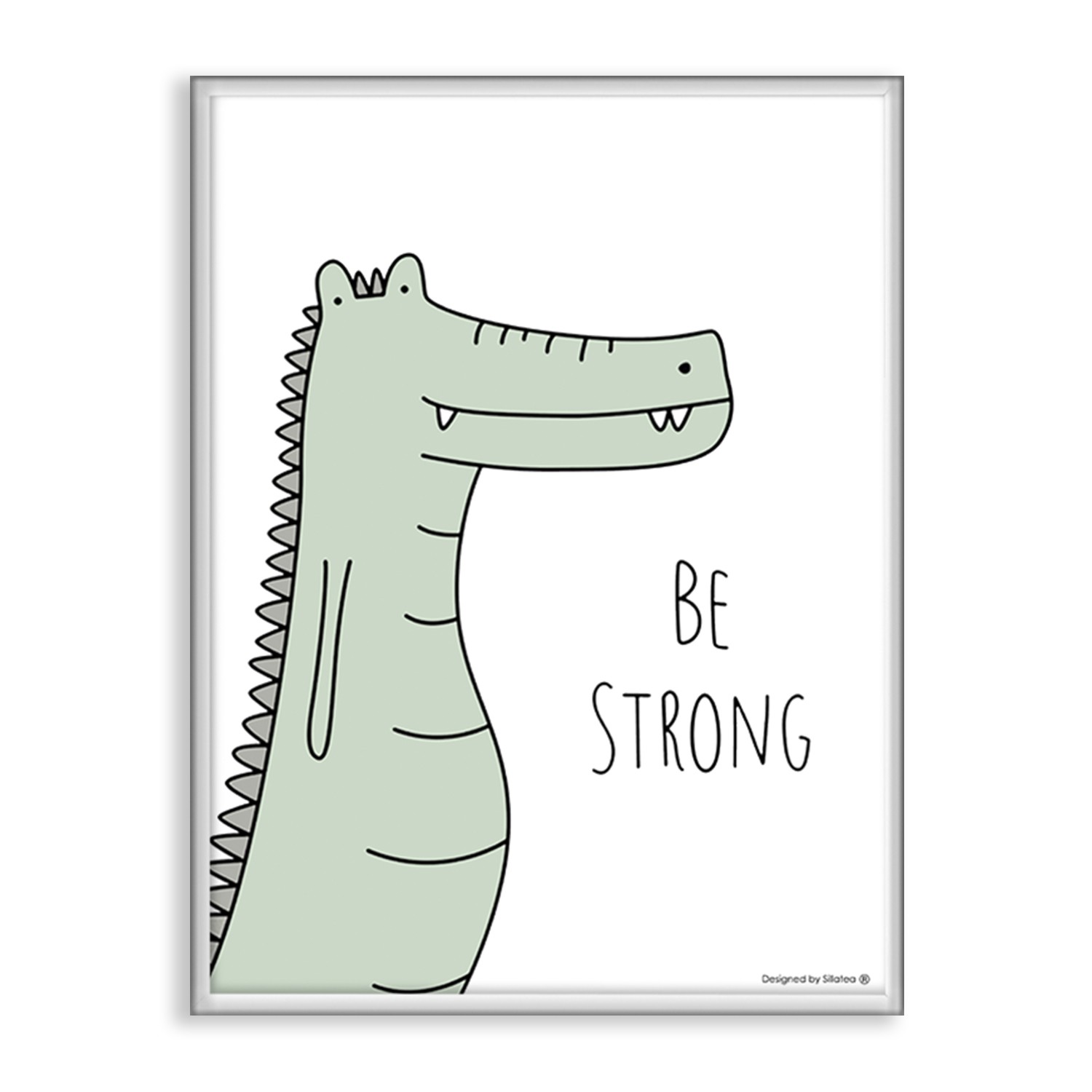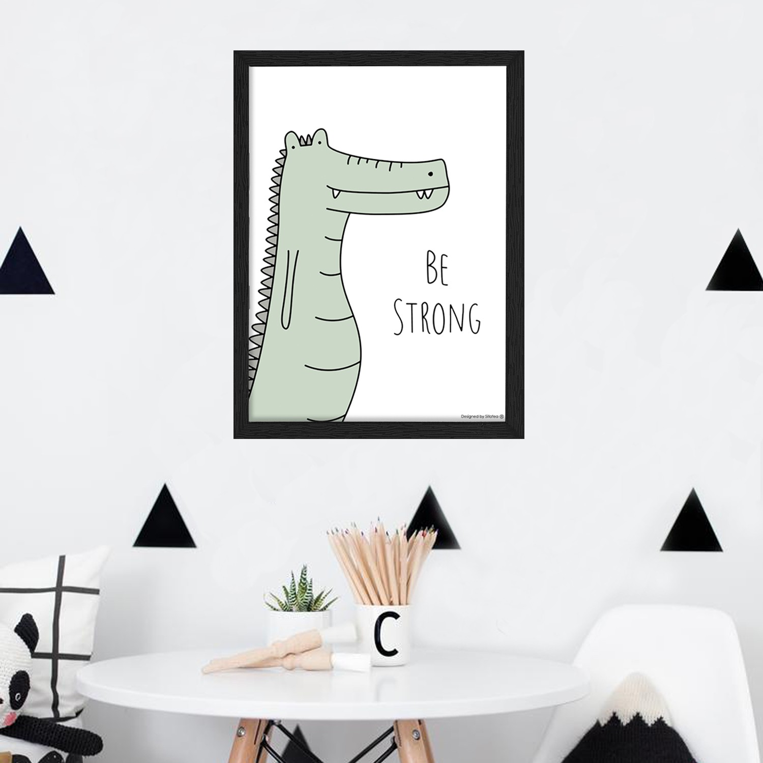 La lámina con marco BABY COCODRILO está diseñada para colgar en la pared de forma bien sencilla, pero también puedes apoyarlo en estanterías o mesas, puede ser una buena opción como elemento decorativo de sobremesa.