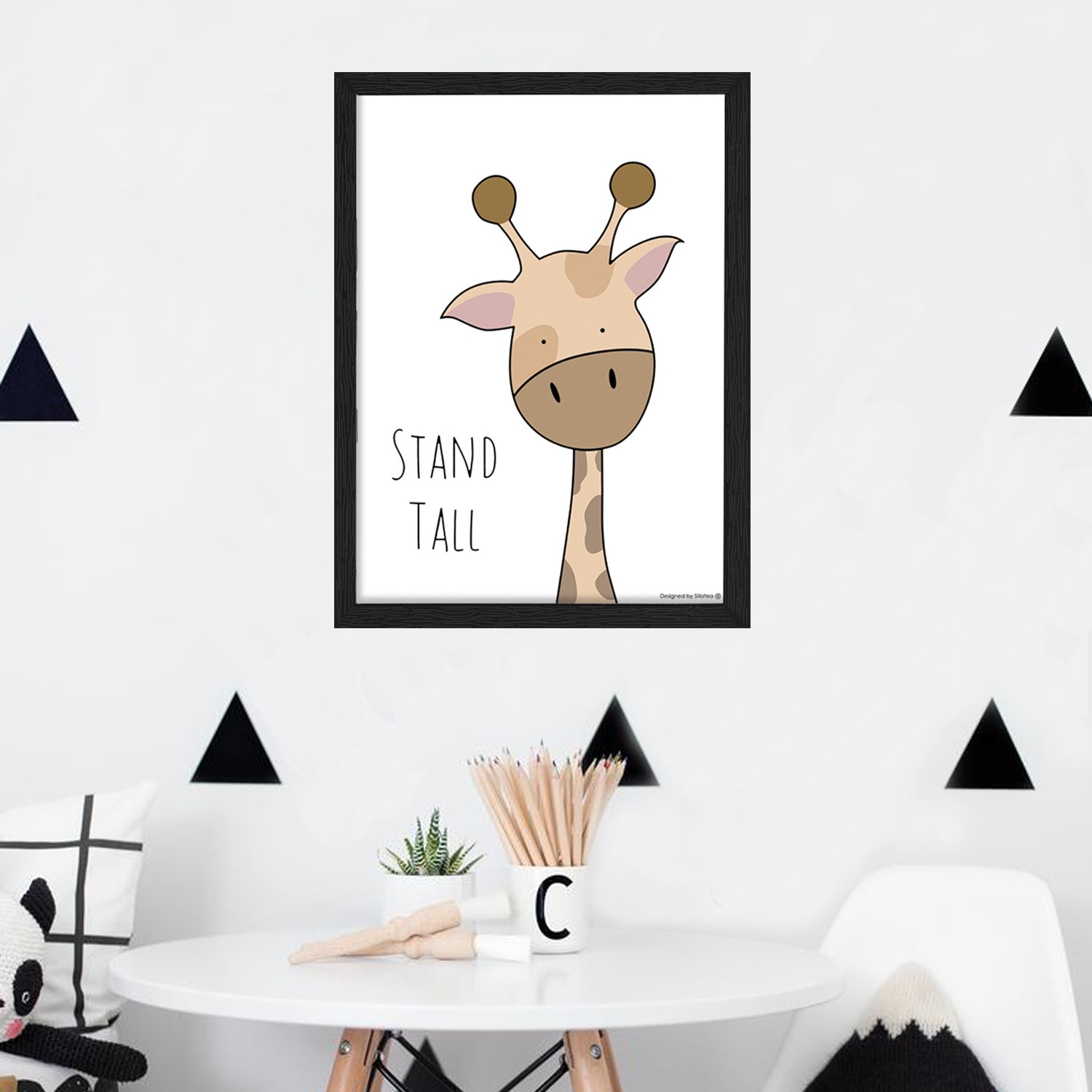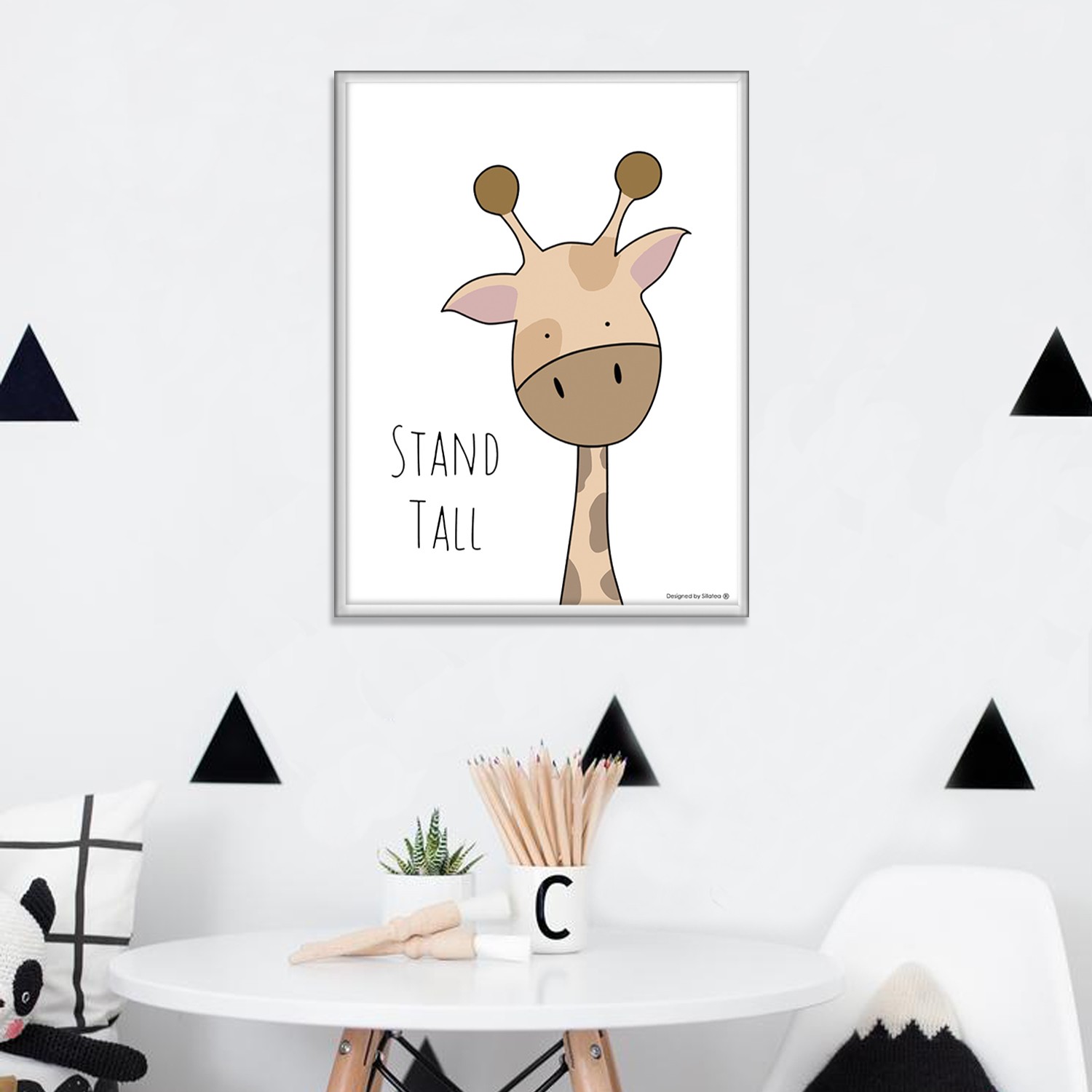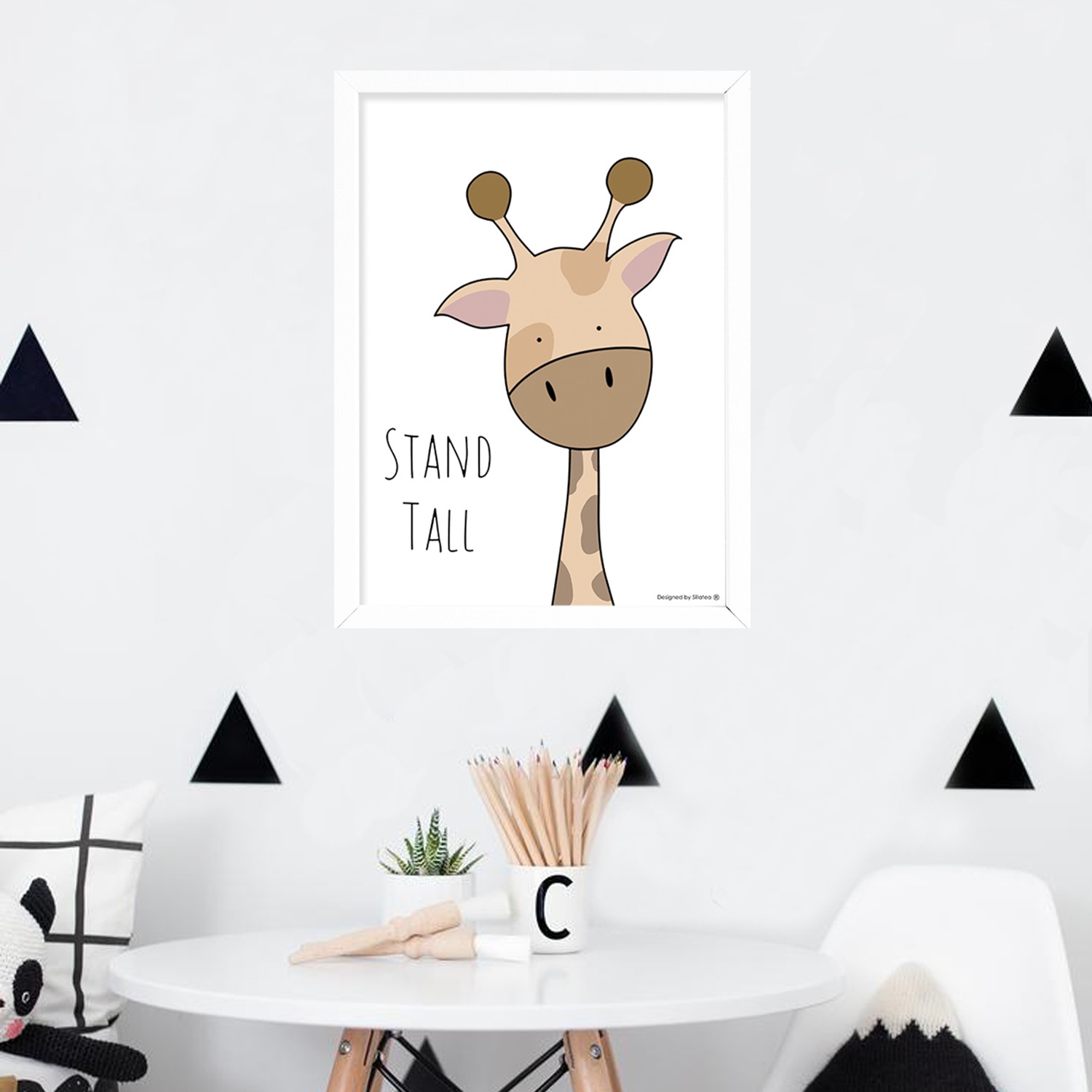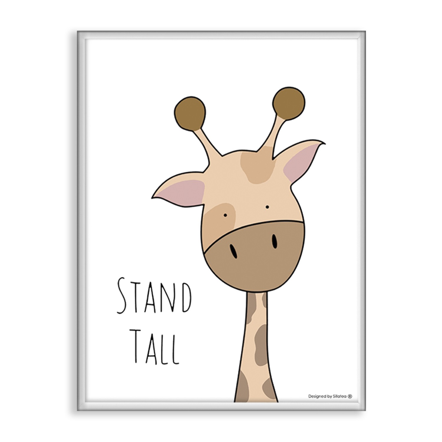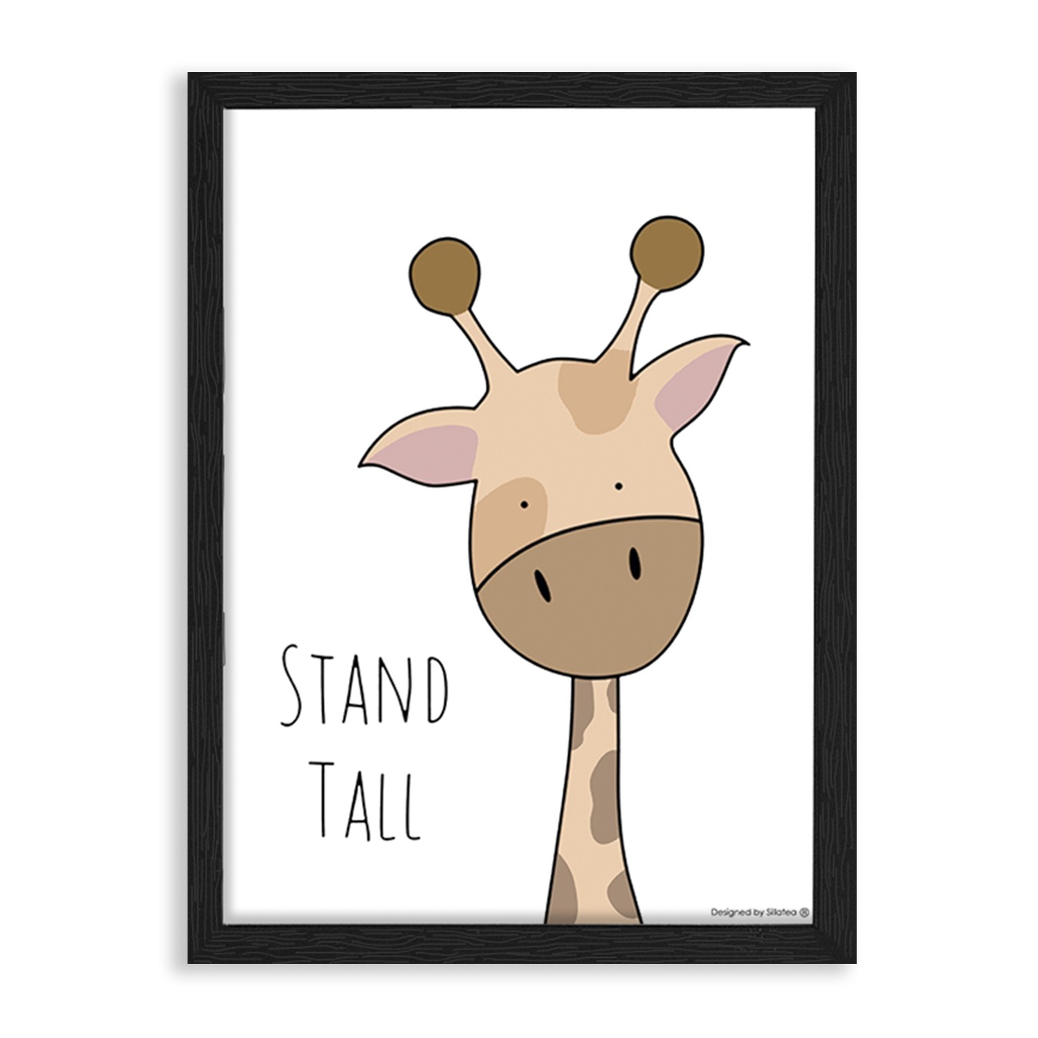 La lámina con marco BABY JIRAFA está diseñada para colgar en la pared de forma bien sencilla, pero también puedes apoyarlo en estanterías o mesas, puede ser una buena opción como elemento decorativo de sobremesa.
