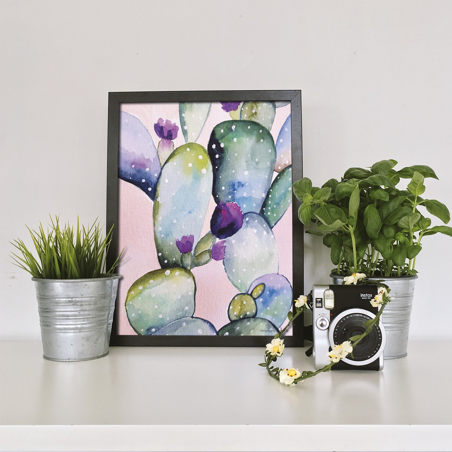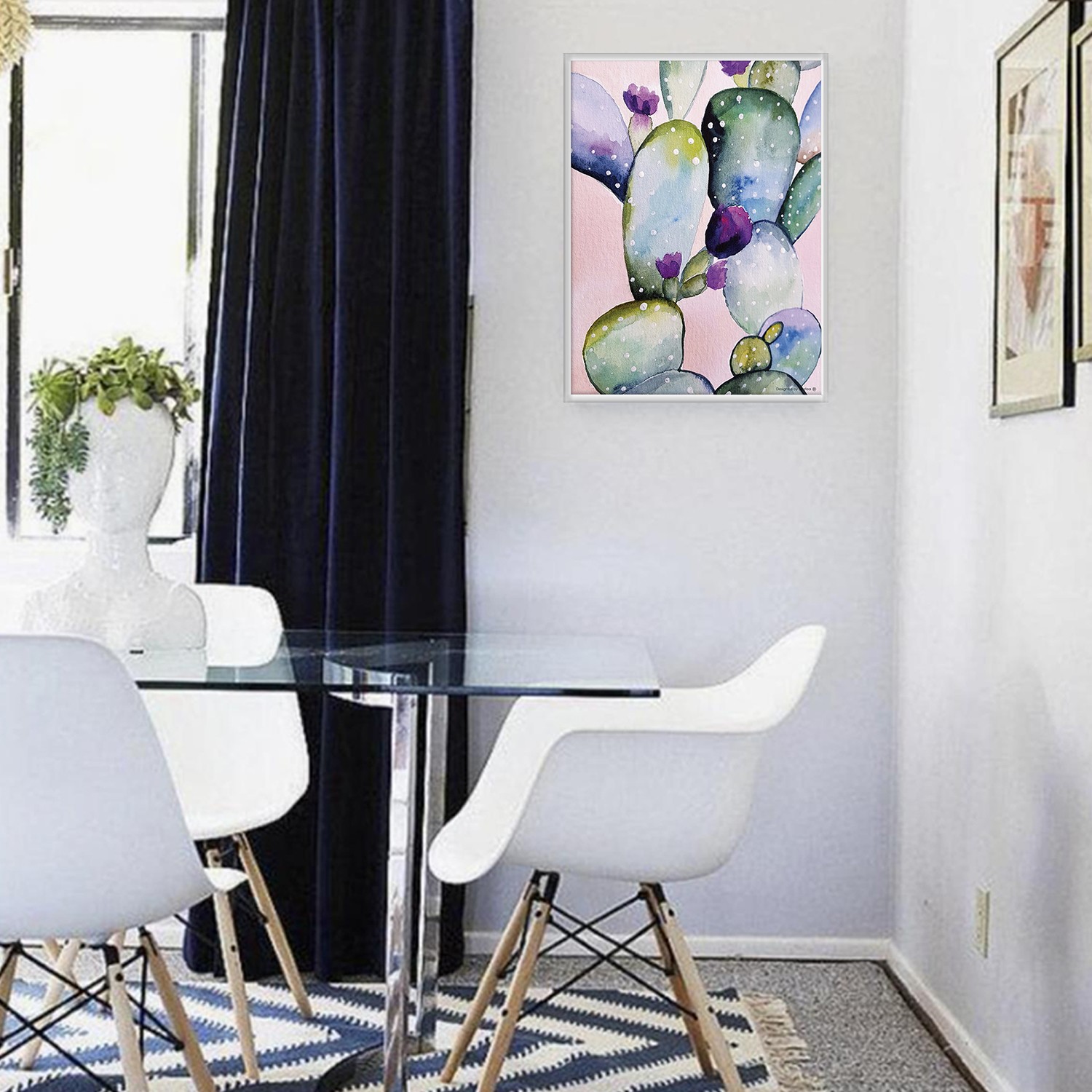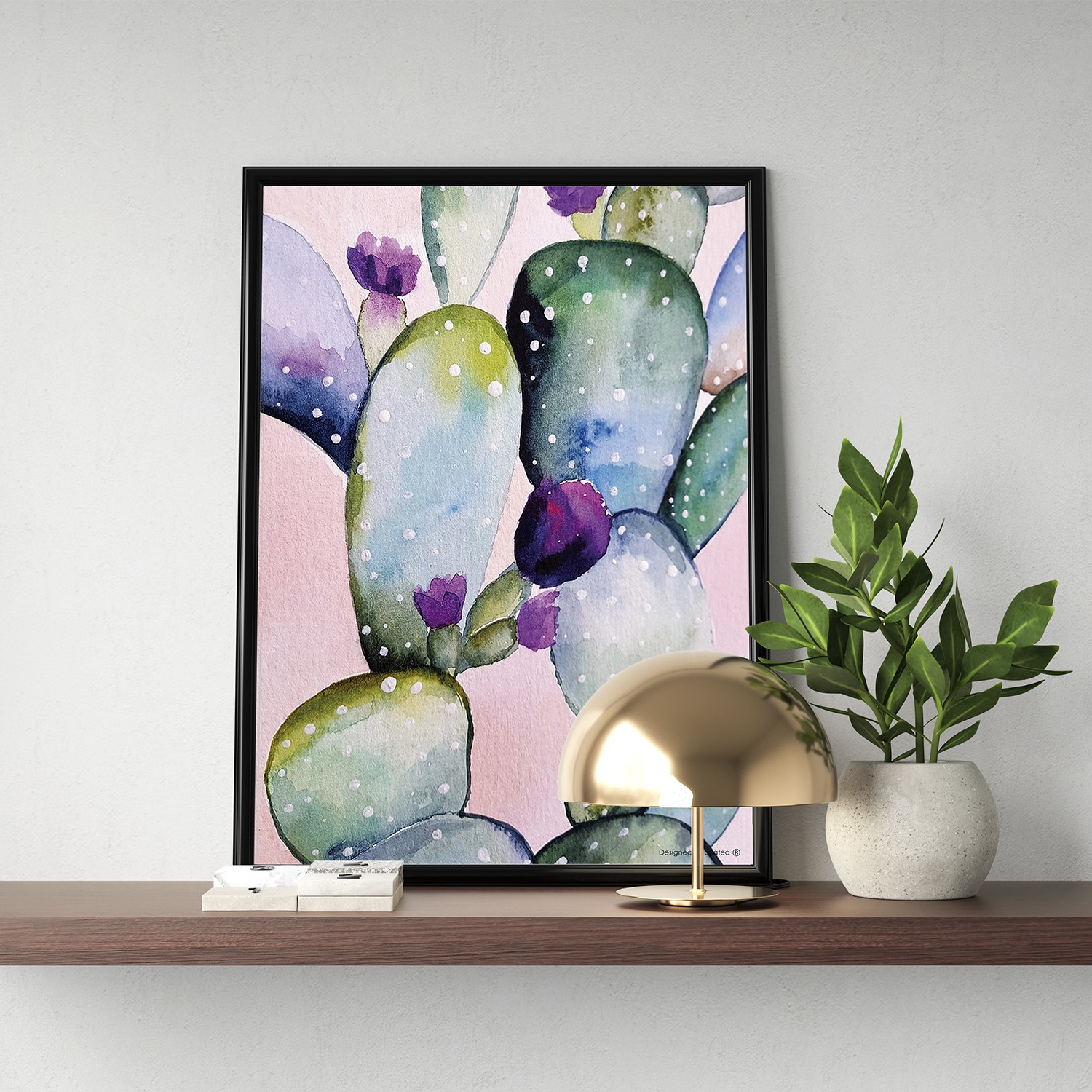 La lámina con marco CACTUS AQUARELLA está diseñada para colgar en la pared de forma bien sencilla, pero también puedes apoyarlo en estanterías o mesas, puede ser una buena opción como elemento decorativo de sobremesa.