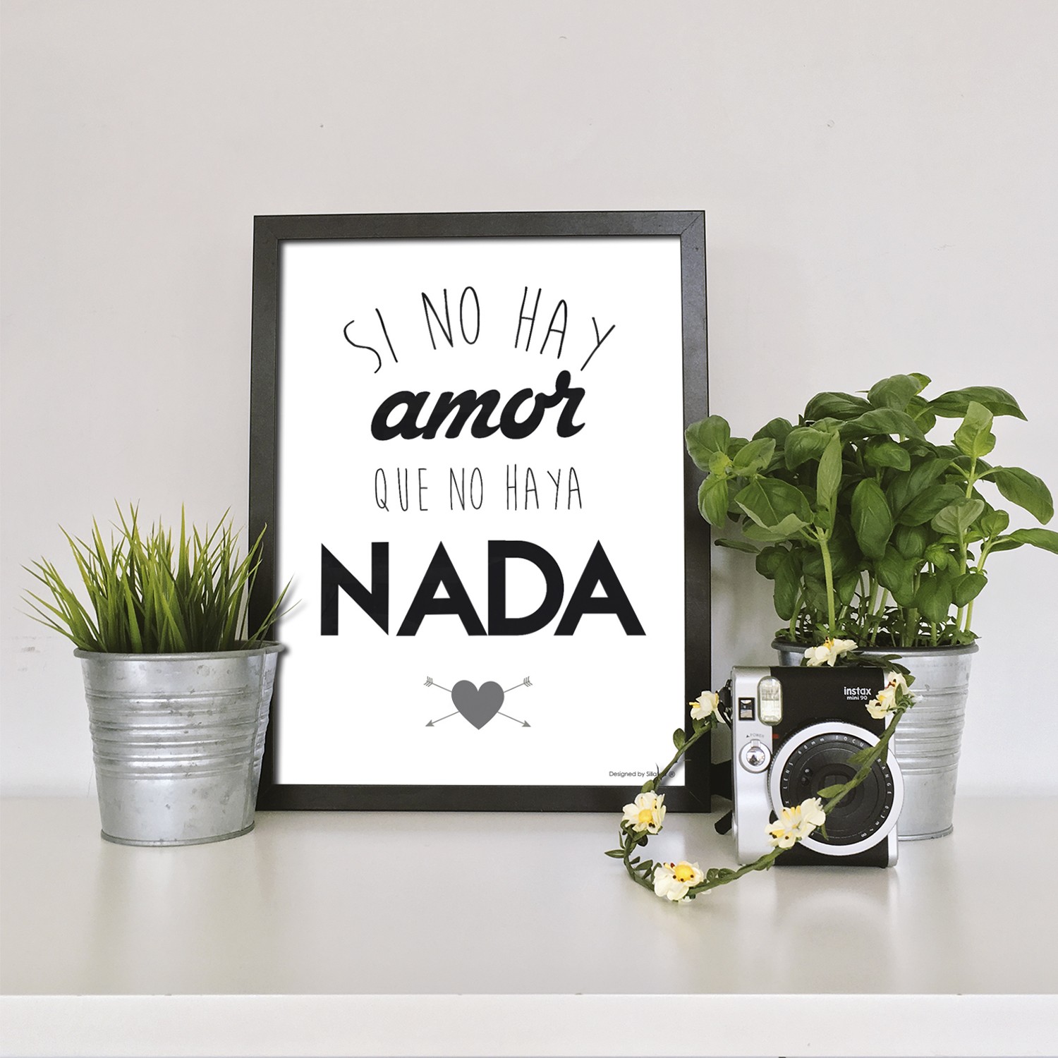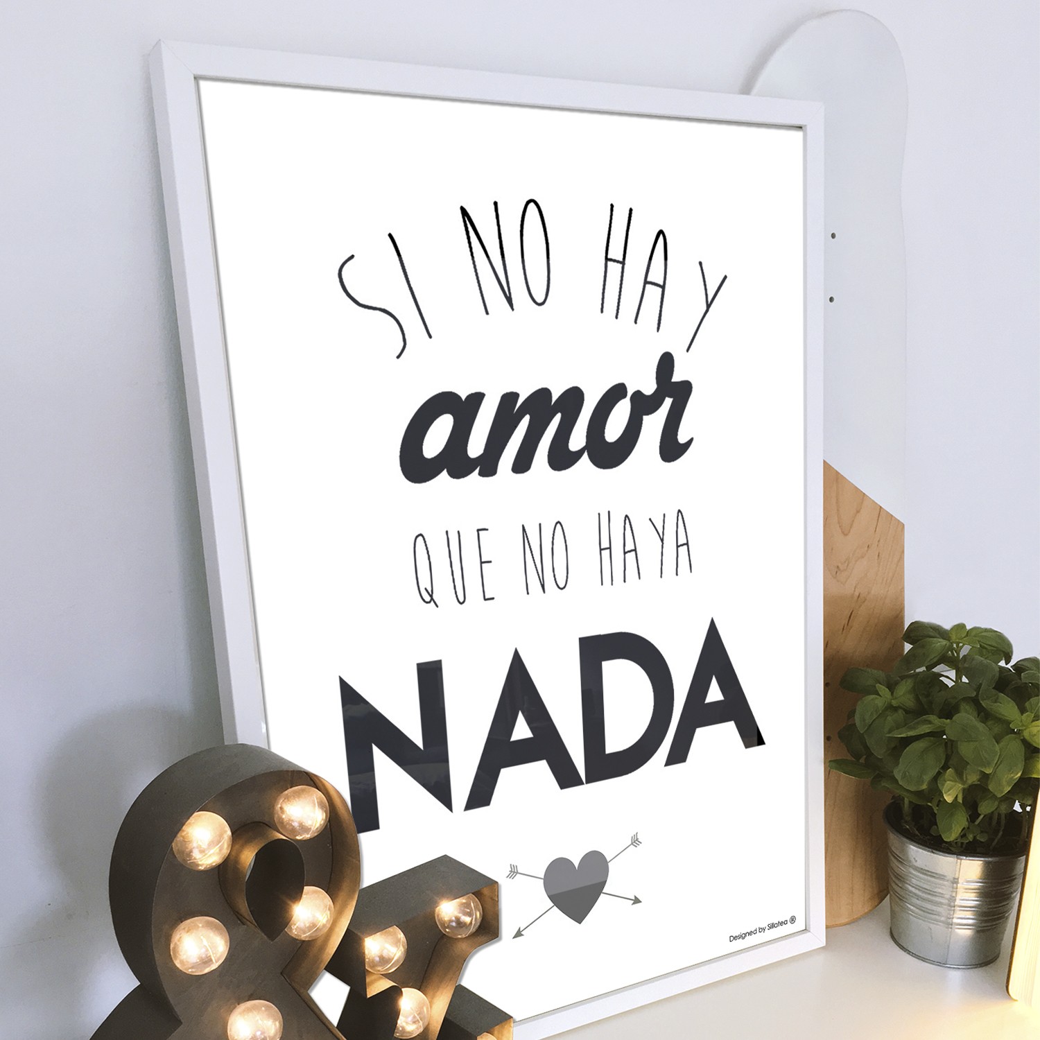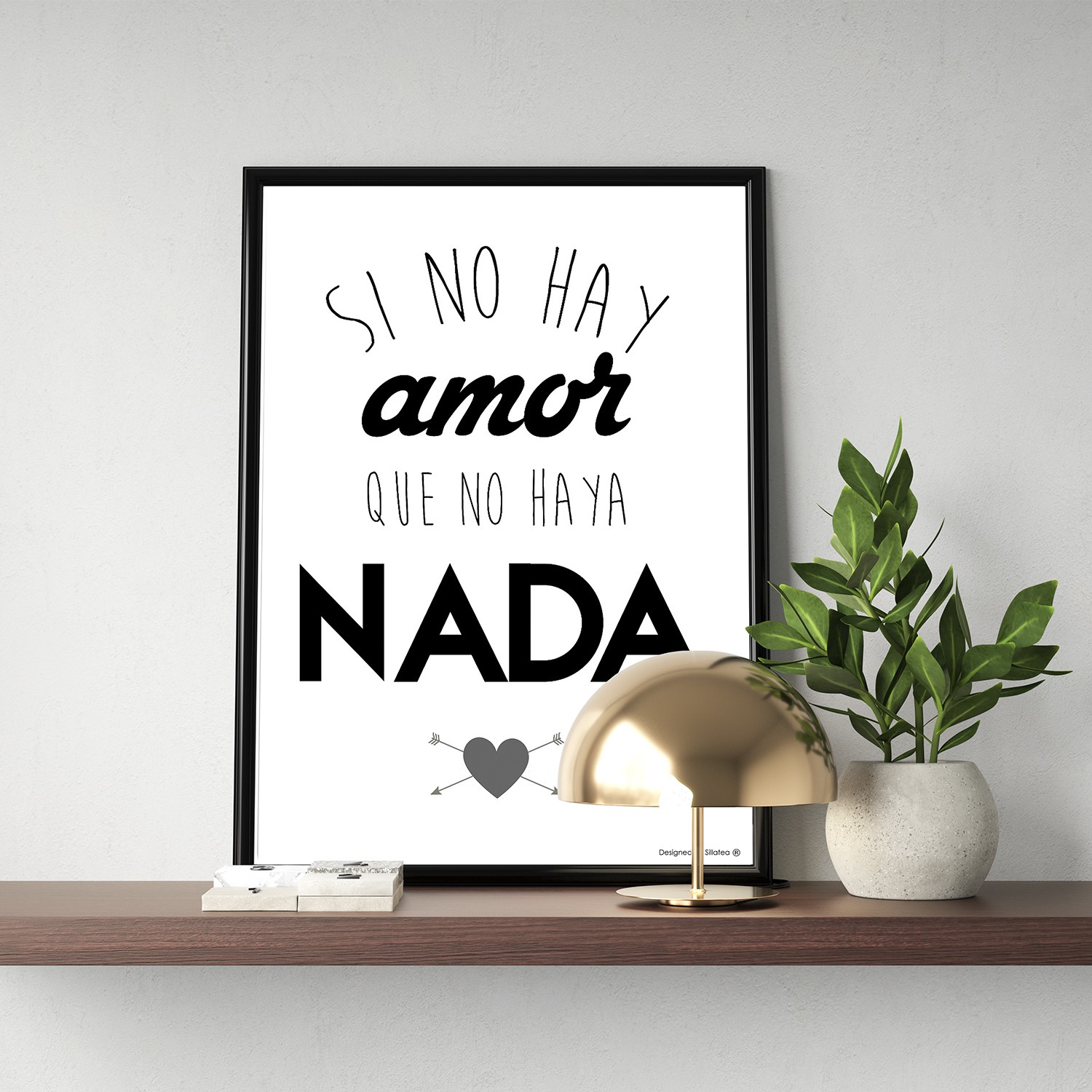La lámina con marco SI NO HAY AMOR está diseñada para colgar en la pared de forma bien sencilla, pero también puedes apoyarlo en estanterías o mesas, puede ser una buena opción como elemento decorativo de sobremesa.